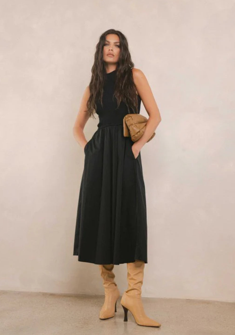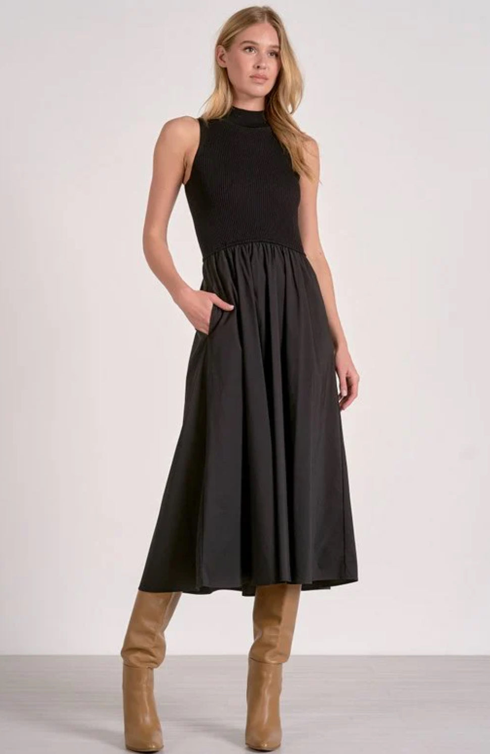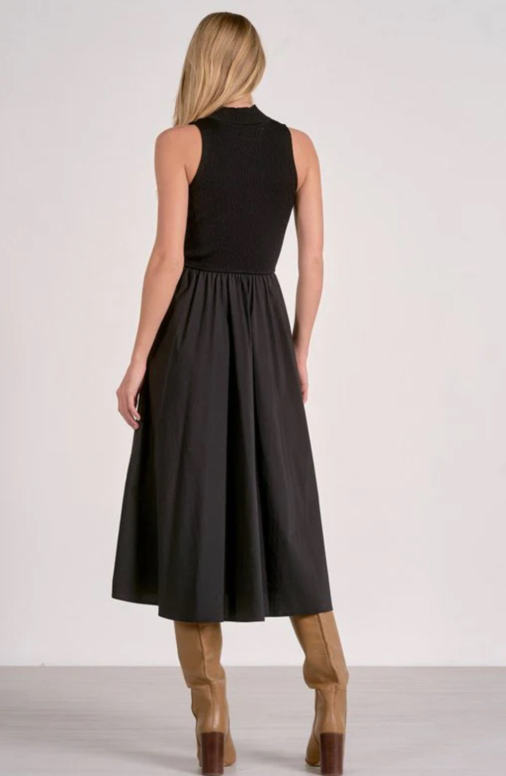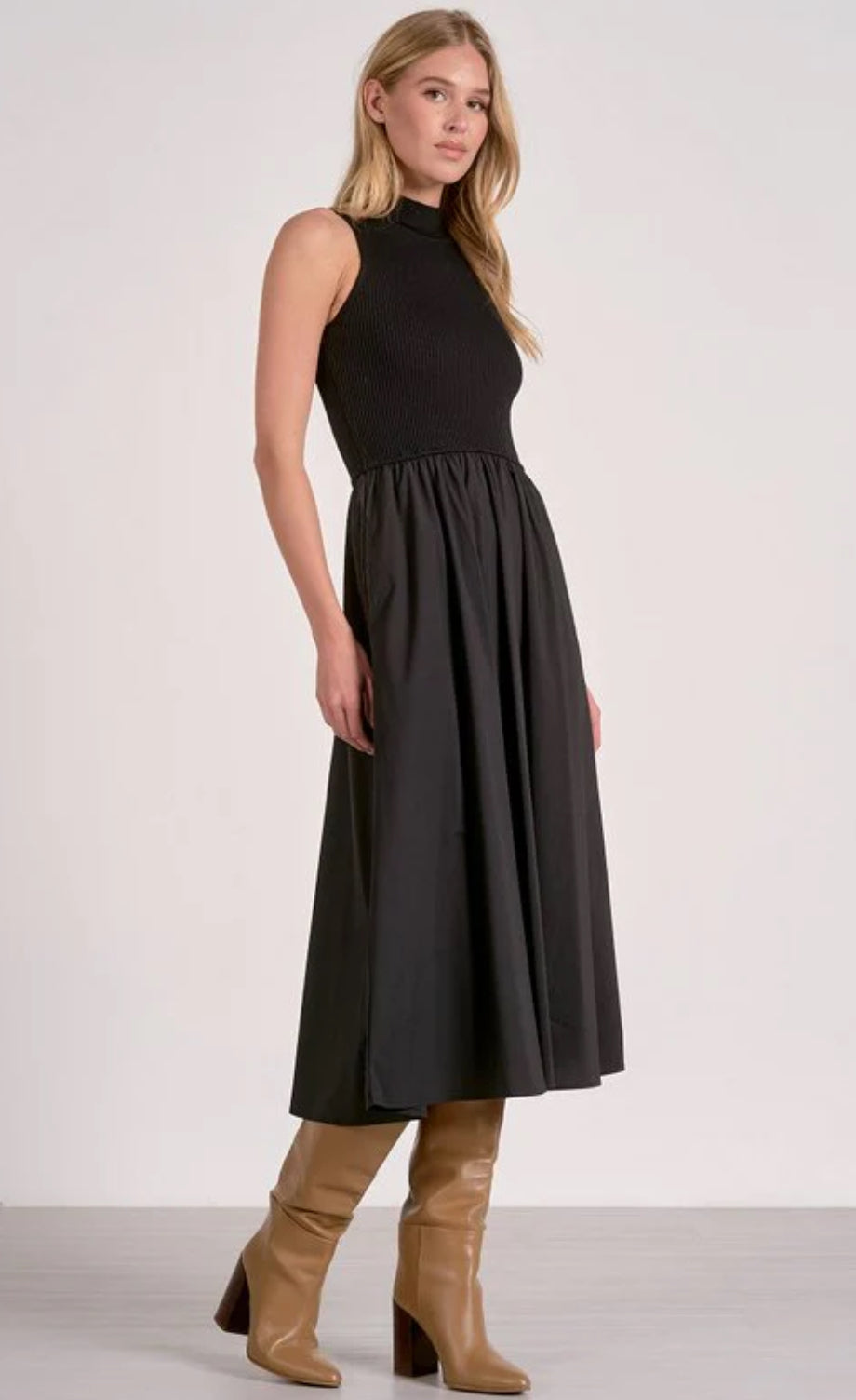 Sculpted up top, swingy down low — the Elsie Dress features a fitted mock neck bodice and a full gathered skirt for a silhouette that flatters every figure. Sleeveless and easy to layer, it’s perfect for any fall occasion.