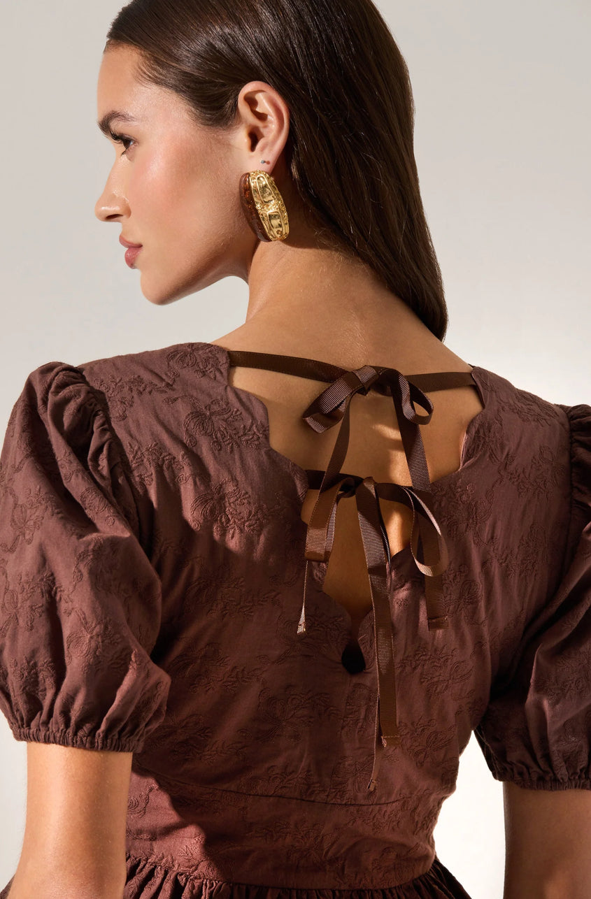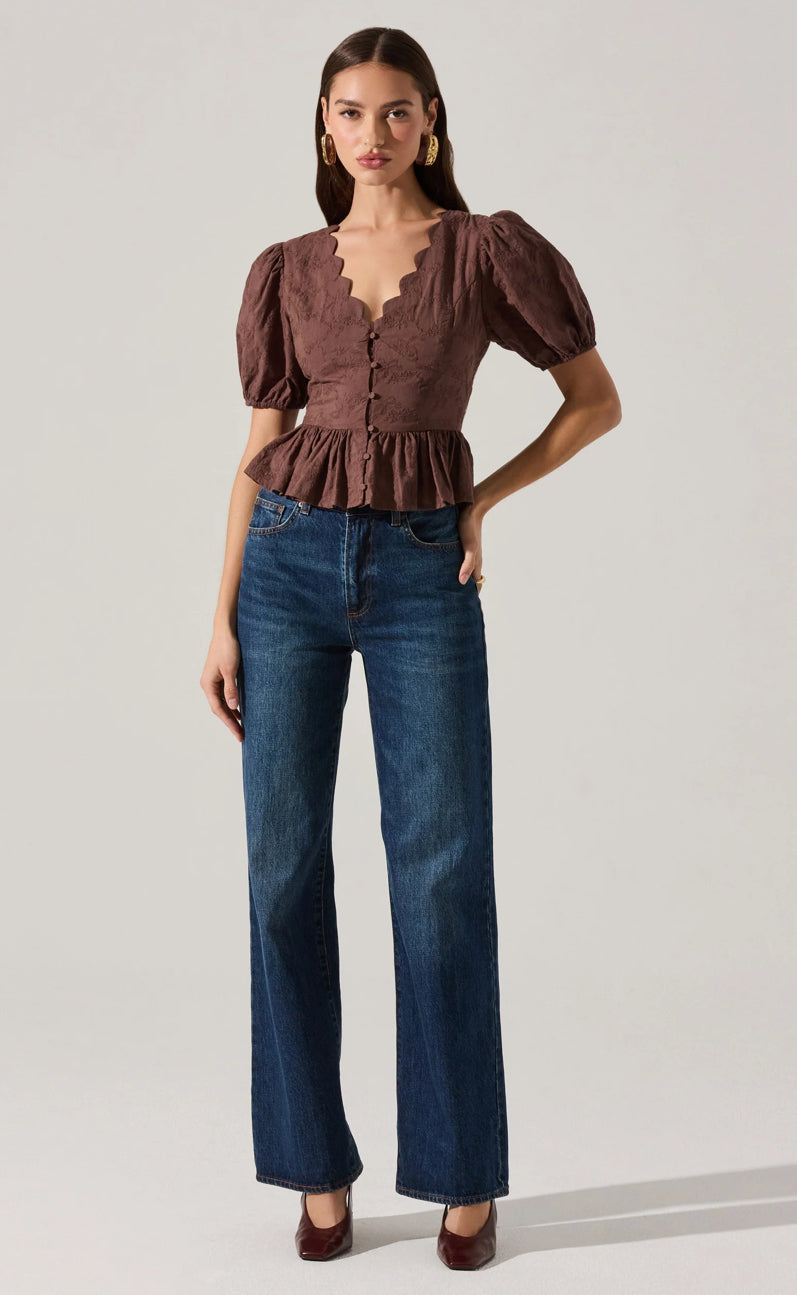 The blouse features a delicate scalloped V-neckline that adds a soft, feminine edge to the profile. Includes a short puff sleeve with a playful touch while balancing the structured bodice.