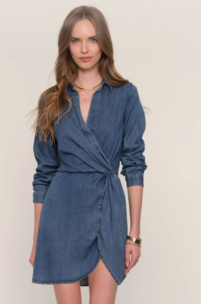 Elias Dress is a soft denim, wrap dress. It has a wrap front and wrap skirt. Scrunch up the sleeves and style it with a pair of knee high boots.