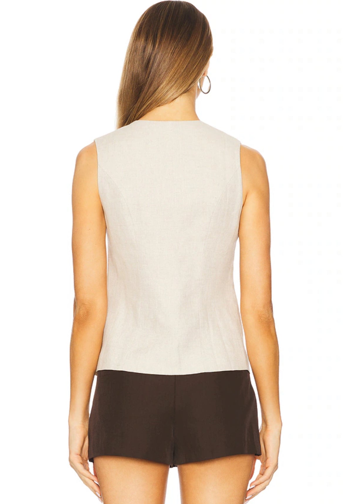 This linen vest is a tailored, sleeveless piece with a modern, structured silhouette. Made from a light, natural-colored linen fabric, it features a round neckline and a row of bold, tortoiseshell-style buttons down the front. The vest is designed with a flattering, slightly fitted waist that flares gently at the hem, adding shape and elegance. A subtle front slit at the bottom of the button placket adds a contemporary touch, while the clean back keeps the look sleek and polished. Perfect for warm-weather layering, this vest can be styled casually or dressed up for a chic, minimalist look.