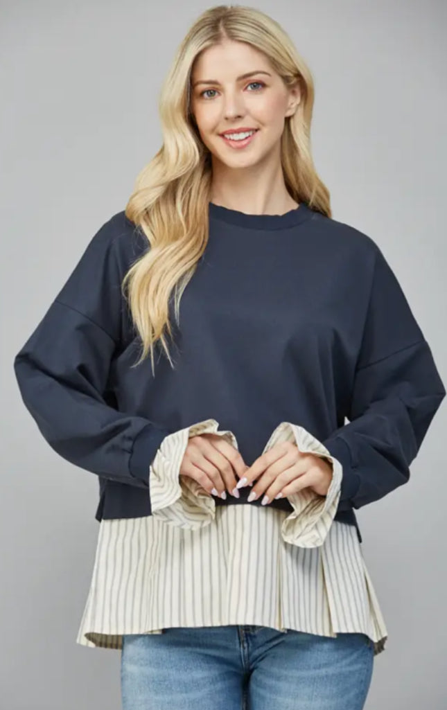 This top is effortlessly layered look is a casual chic with a clever layered design. This cozy pullover features a soft, solid colored sweatshirt base seamlessly fused with a classic striped woven shirt detail, giving the illusion of two pieces in one. Ideal for workdays, weekends, and everything in between.