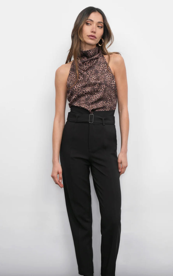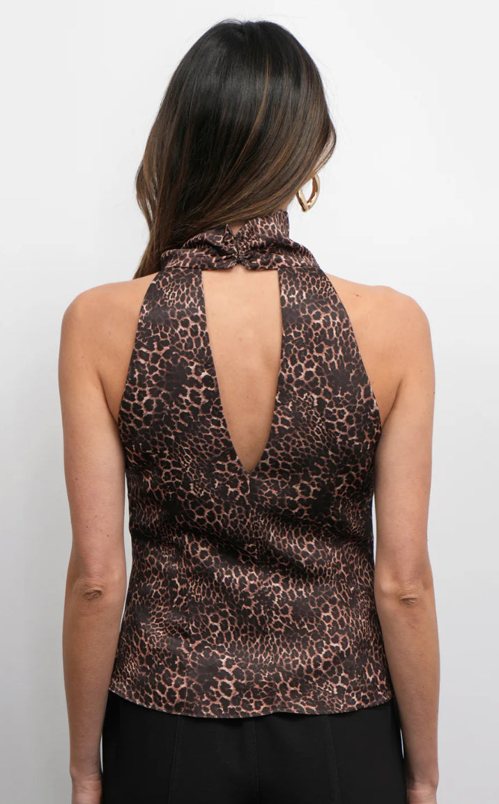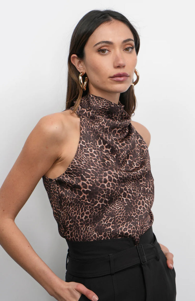 Crafted from a smooth, satiny fabric, this top features a striking all-over leopard print. It's designed with a unique funnel neckline that drapes elegantly into a soft cowl at the front. The halter silhouette showcases the shoulders and back, while the back tie closure ensures a customizable and secure fit.