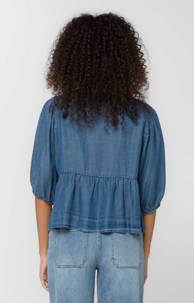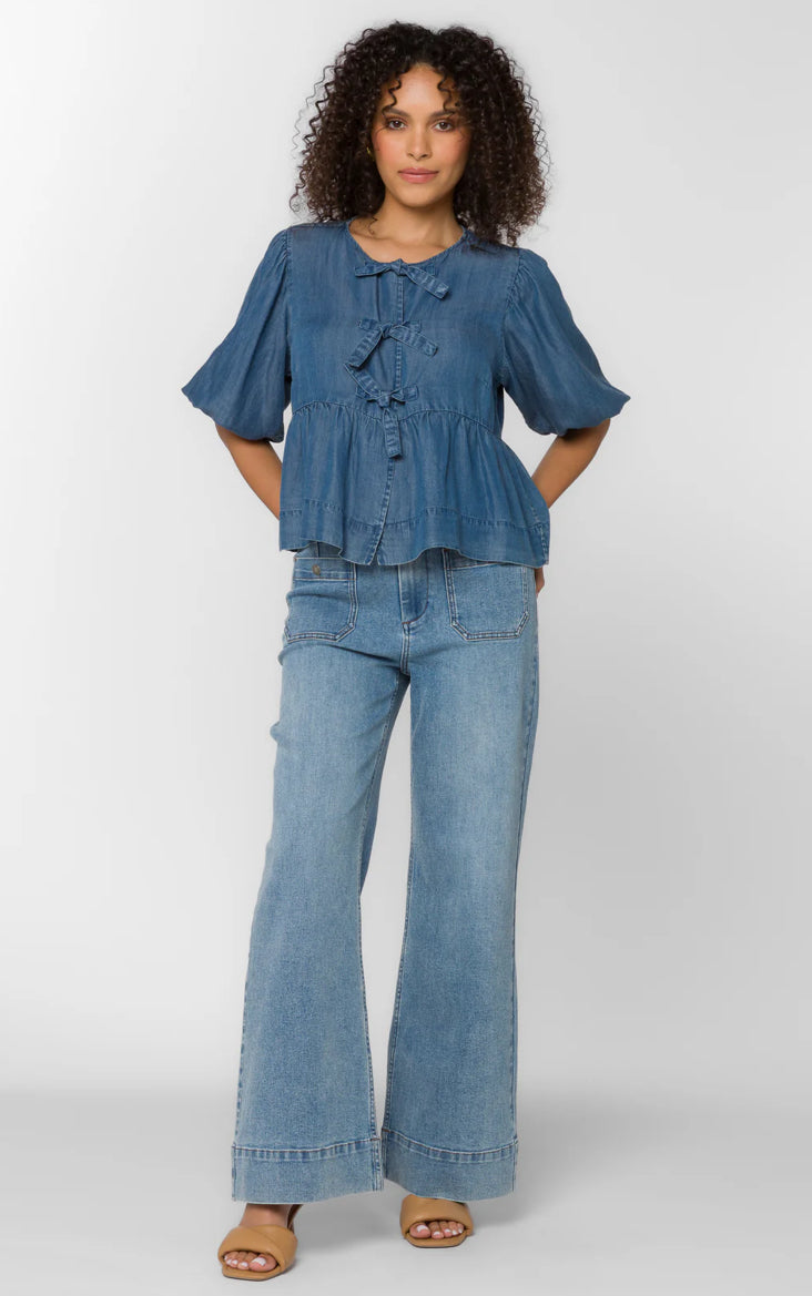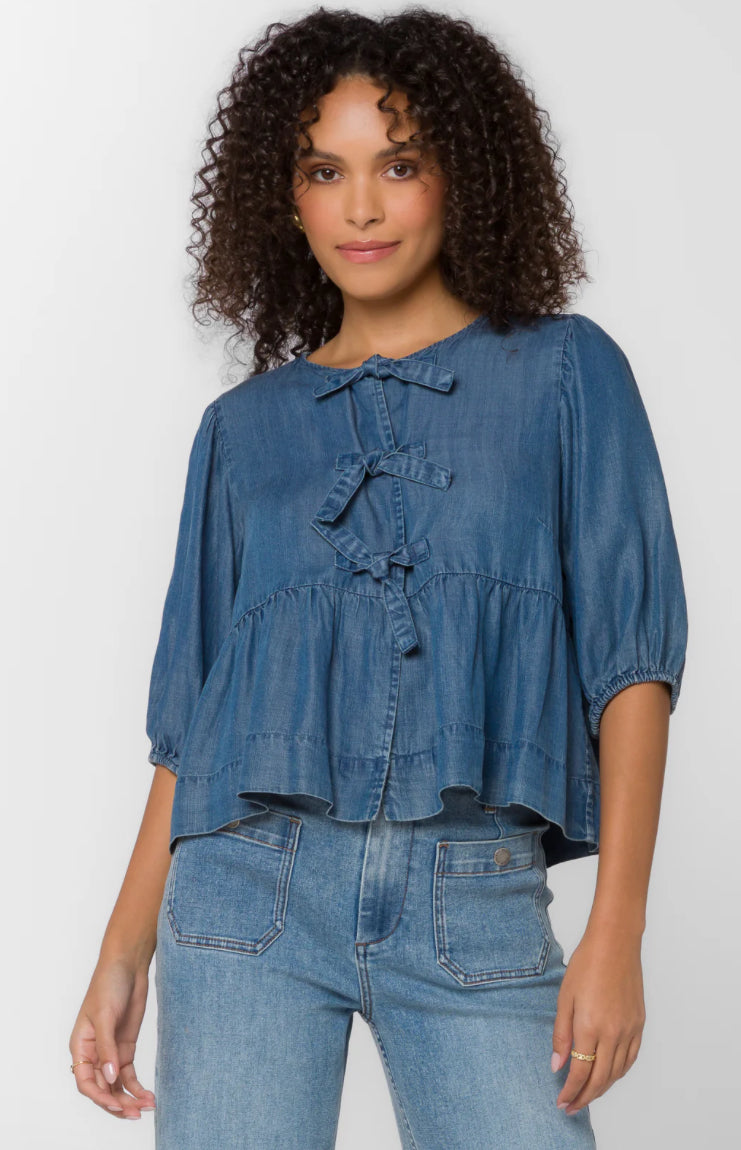 This puff sleeve peplum top features a triple bow front tie, soft flowy drape and is smooth to the touch.