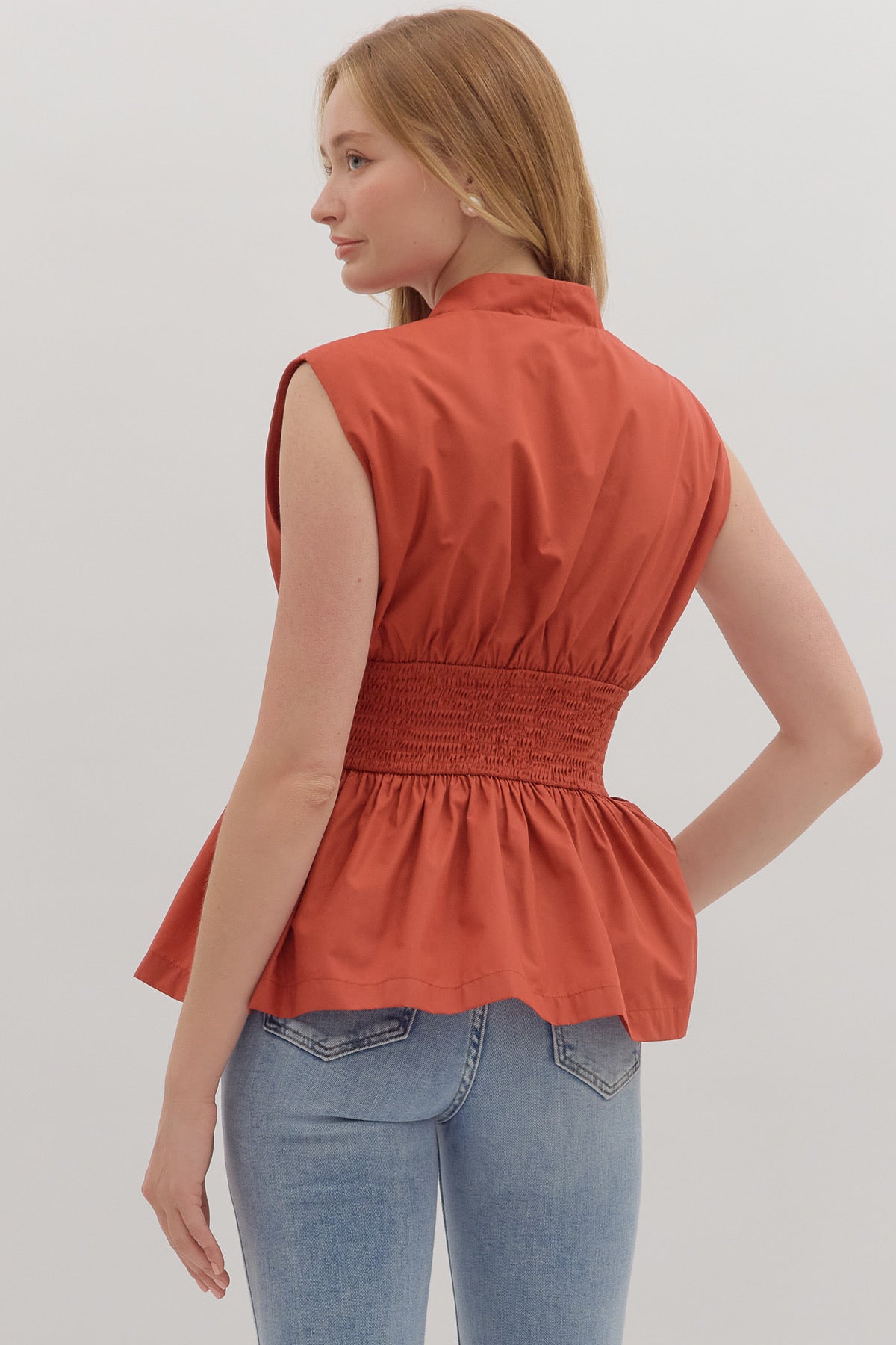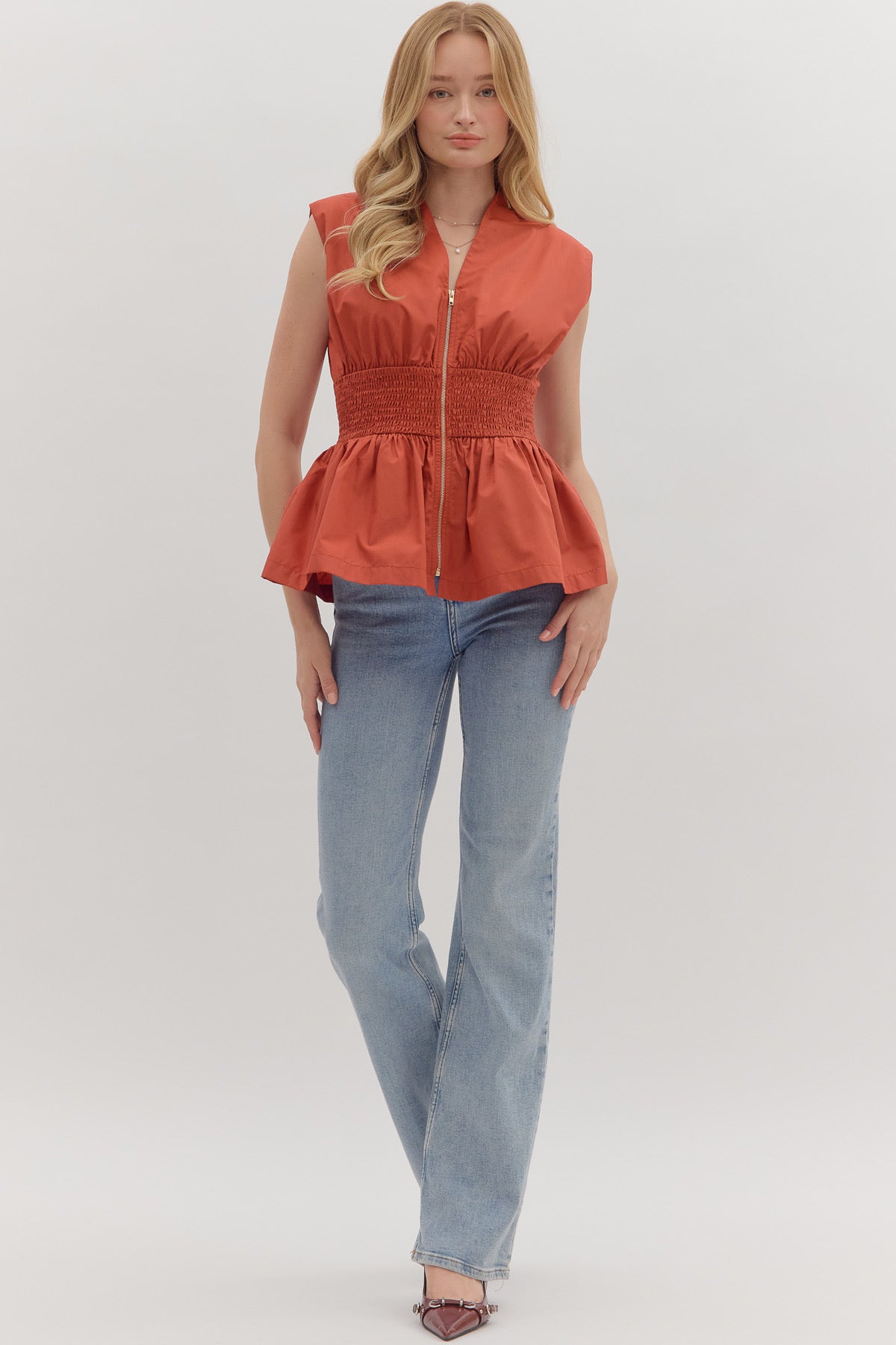 Introducing our chic and trendy peplum top, perfect for adding a touch of flair to your wardrobe! This stunning burgundy piece features a stylish zip-up front and a flattering smocked waist that accentuates your silhouette beautifully. The sleeveless design keeps you cool and comfortable, while the playful peplum hem adds a fun twist. Pair it with your favorite denim skirt for a casual day out or dress it up for a night on the town. Elevate your style effortlessly!