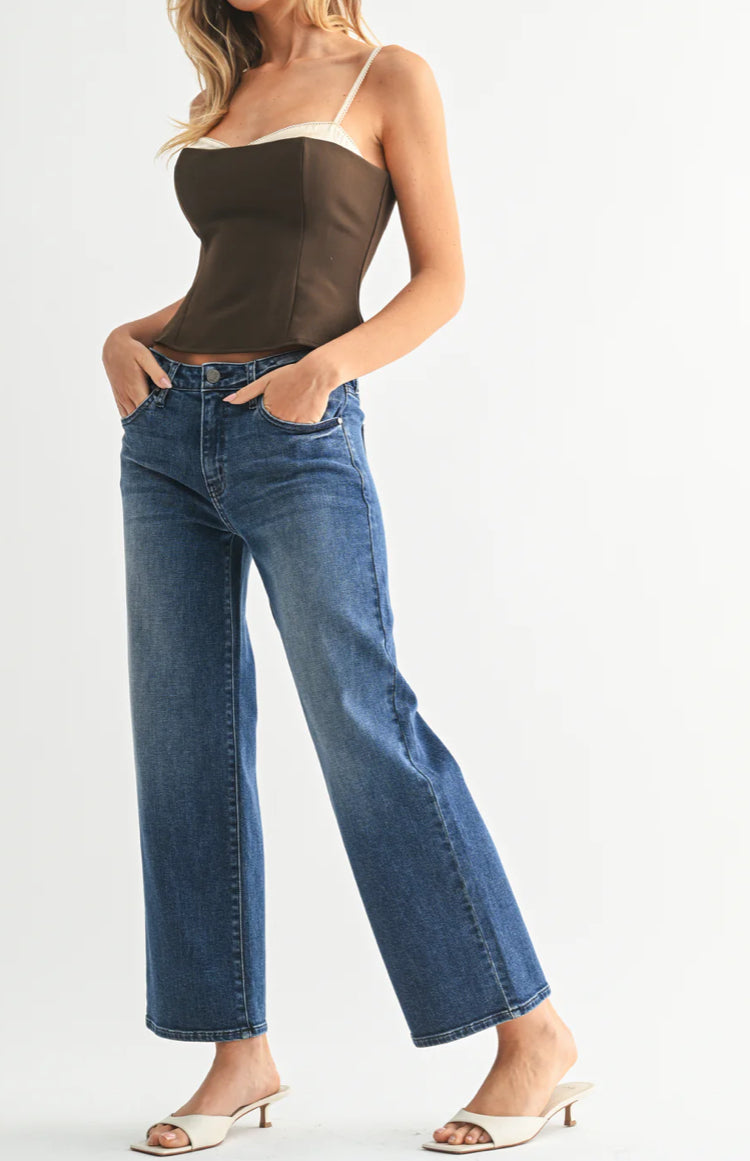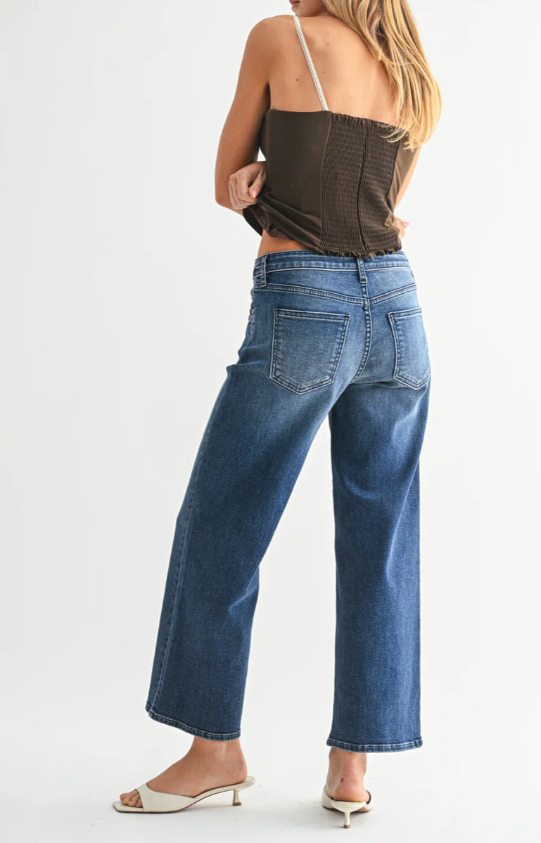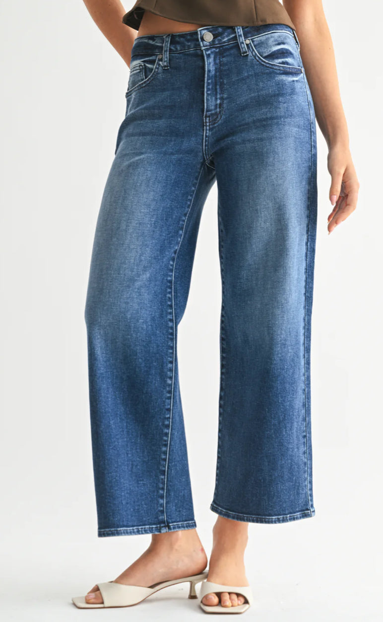 Designed for petites, this jean rests comfortably at the mid waist for a flattering, well-balanced silhouette. The slim cut through the hips and thighs transitions seamlessly into a refined wide leg, striking the perfect blend of structure and ease.