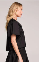 The Zaylah Top elevates the classic button-down with a roomy fit, deep V neckline, and cap sleeves for a refined silhouette.