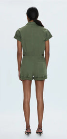 A warm weather favorite! Short sleeve romper silhouette designed for a relaxed fit, with a button up bodice and waist for adjustable coverage and fit options, topped with a camp collar neckline.