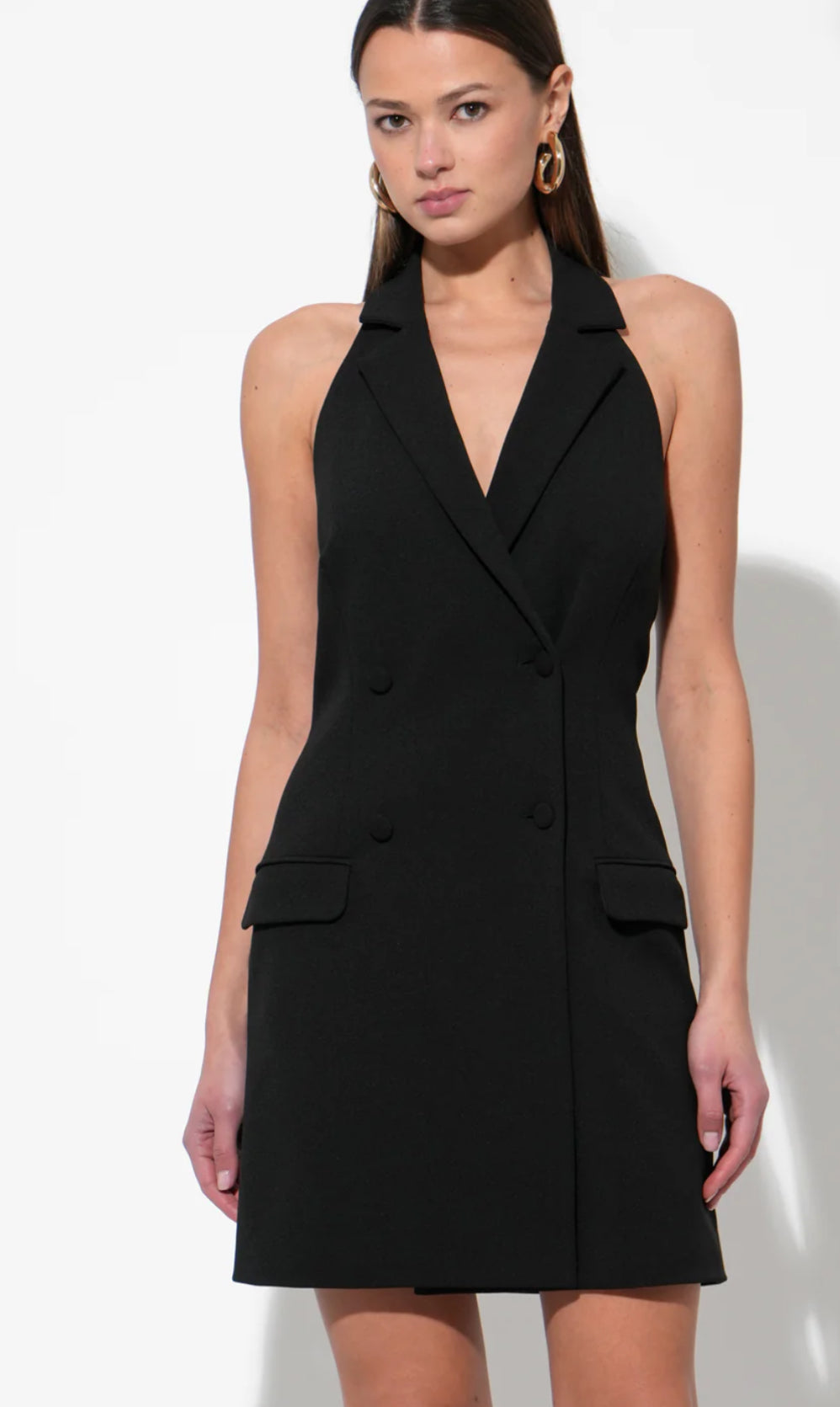 This sophisticated mini dress reinterprets classic suiting with a vest-inspired silhouette, featuring a deep V-neckline and a button-front closure. The tailored fit cinches at the waist to create a sharp and flattering shape, while the mini length adds a contemporary and chic touch.