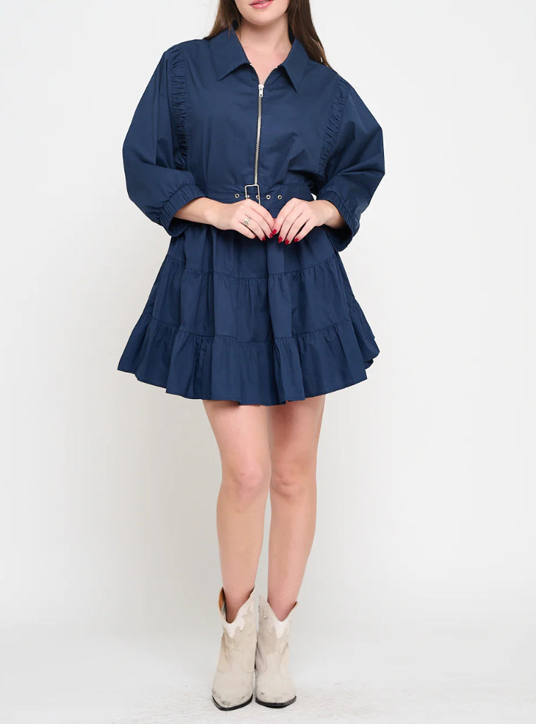 A modern take on utilitarian femininity, the Navy Poplin Zip Up Dress is crafted from structured cotton poplin with a voluminous tiered skirt that moves with ease. The zip-up front and oversized collar add a touch of edge, while gathered seams and an adjustable belted waist cinch in for a flattering shape. Whether you're styling it with western boots for daytime charm or sleek sandals for a polished finish, this dress brings effortless versatility to your resort-ready wardrobe.