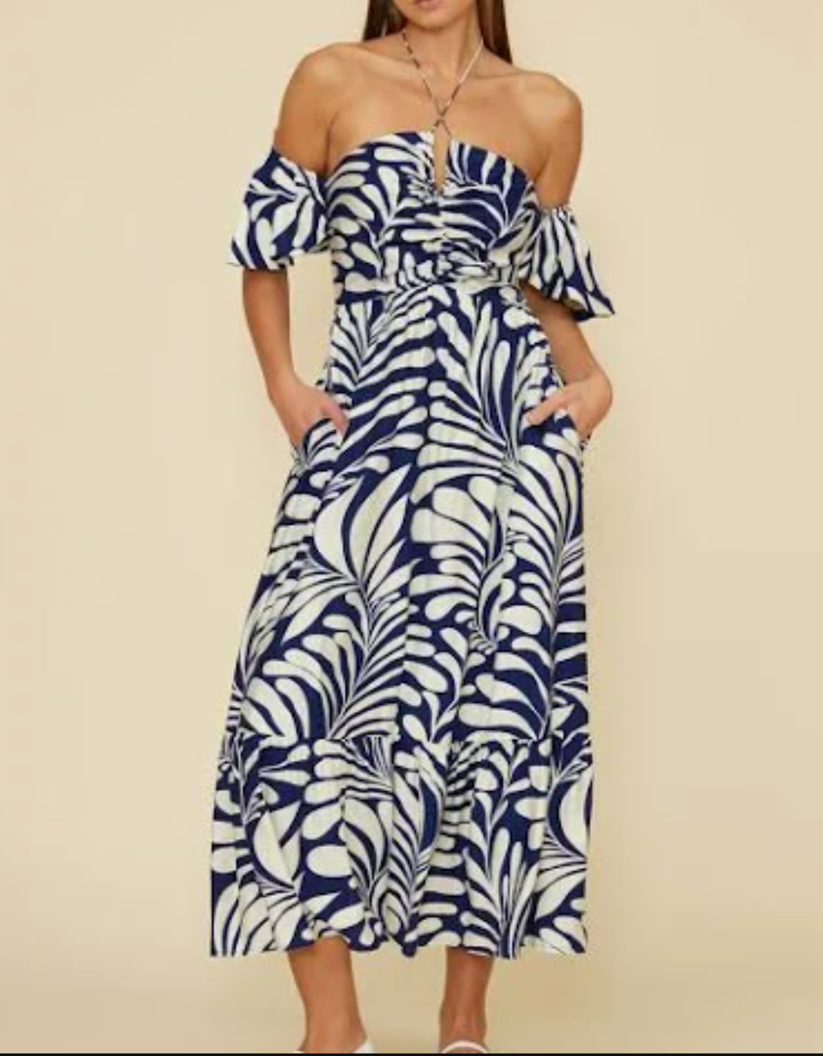 Indulge in luxury with our OPHELIA MIDI DRESS. Show off those shoulders with the elegant off-the-shoulder sleeves, while the halter neck adds a touch of sophistication. With its stunning print, this midi dress is perfect for any occasion. Experience the art of fashion with our exclusive design.
