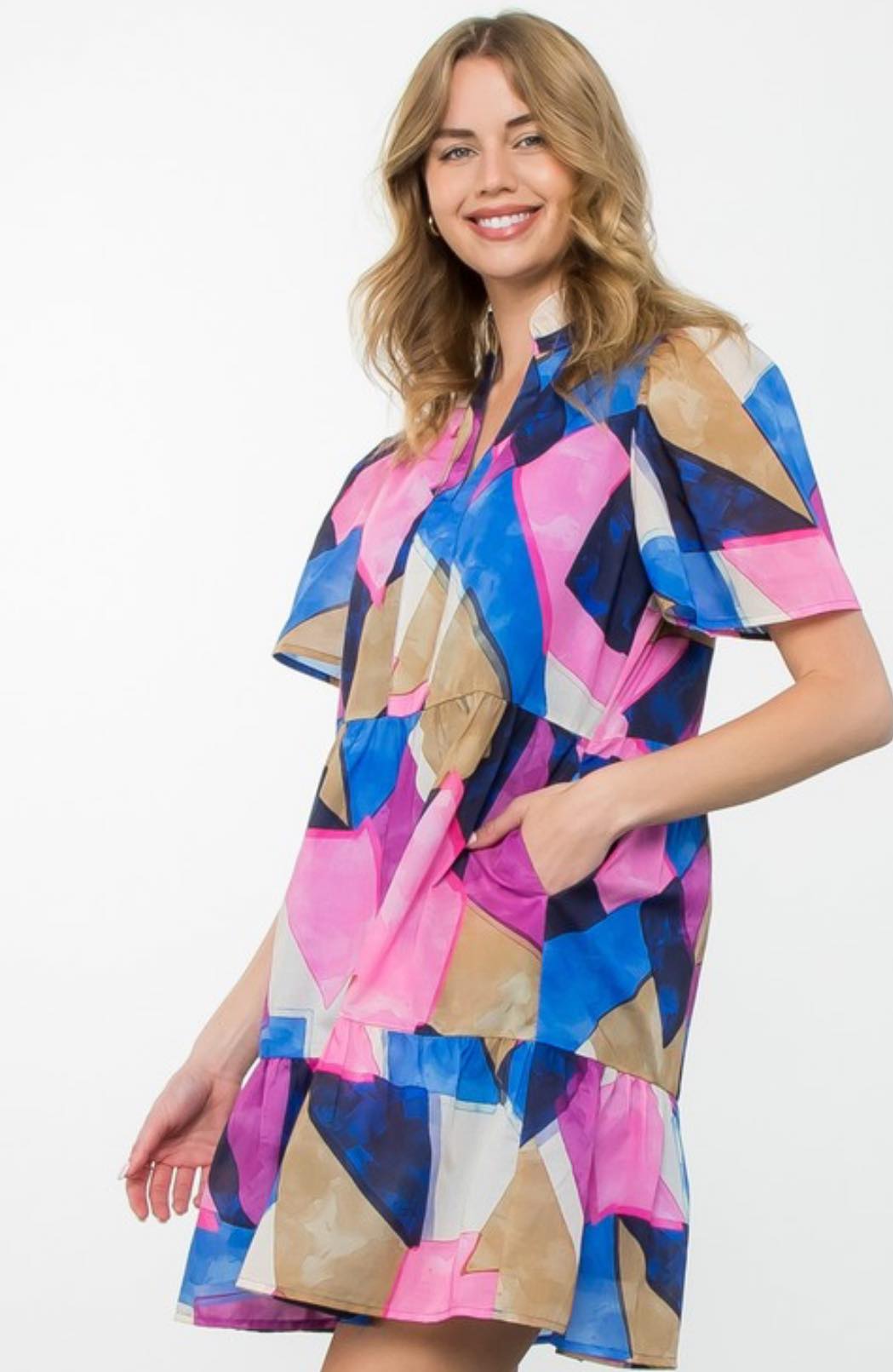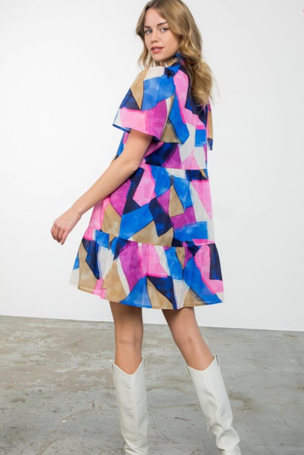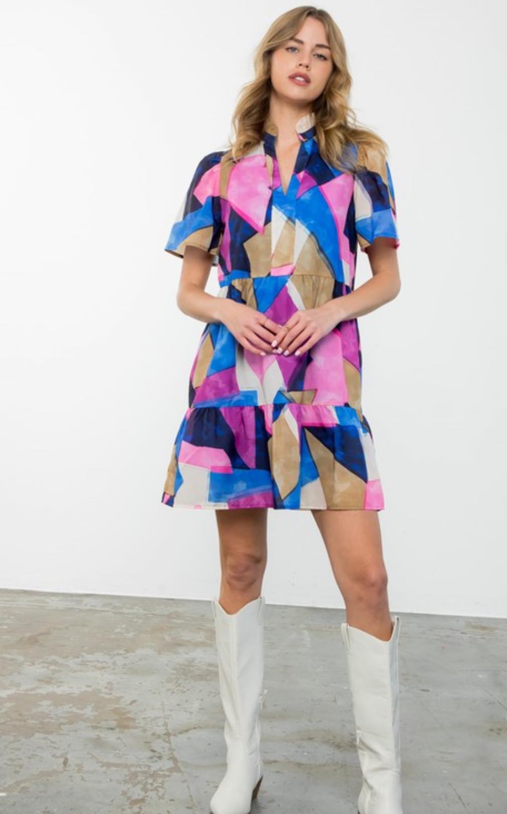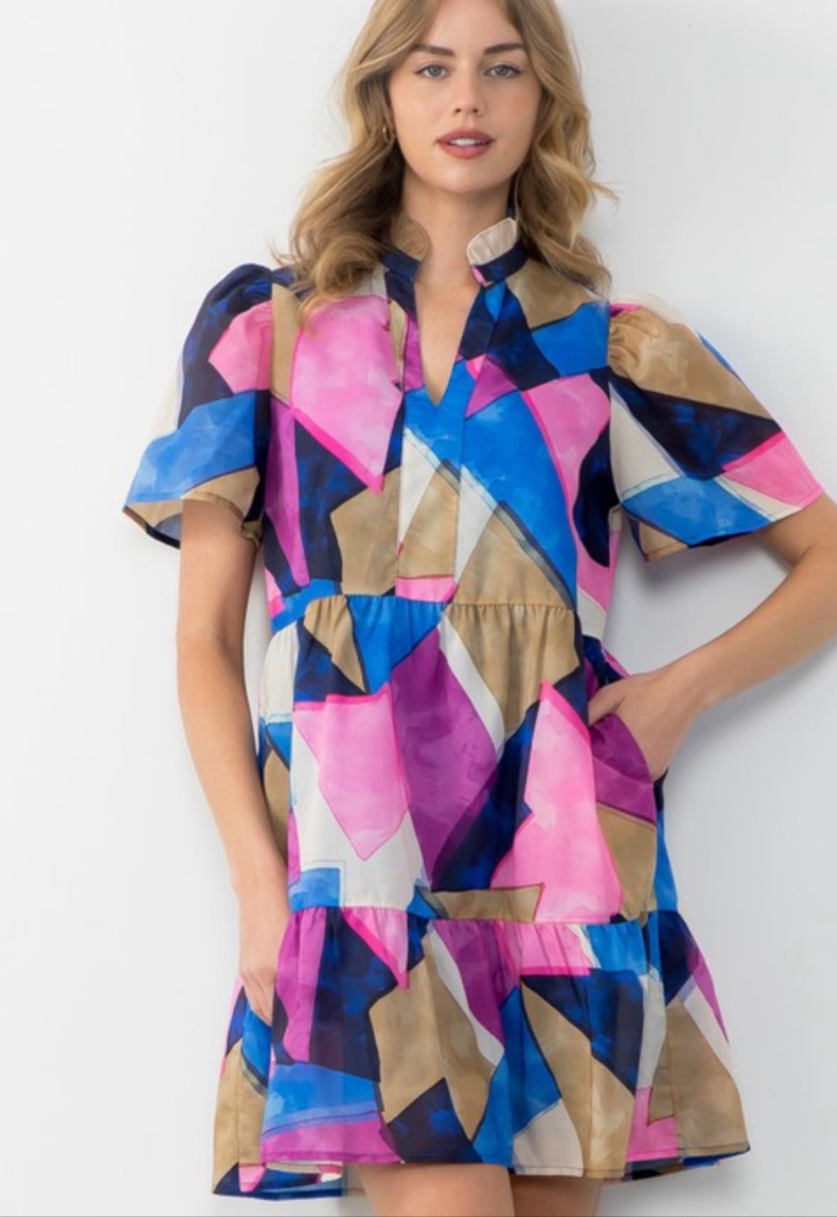 Effortlessly stylish and chic, the Puff Sleeve Multi Color Dress by THML is a must-have for any fashion-forward wardrobe. The playful abstract print is complemented by the flattering v-neck and ruffle collar. The puff sleeves add a touch of femininity while the lining ensures maximum comfort. Perfect for any occasion.