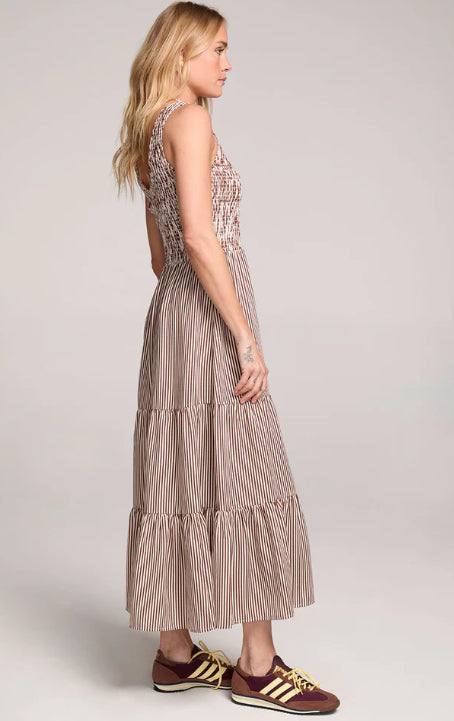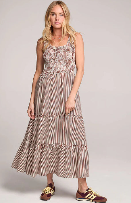 The Memphis Midi Dress features a textured gathered bodice and a full tiered skirt that flutters with every step.