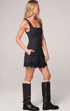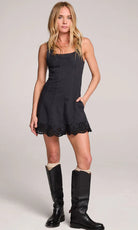 The Miramar Mini Dress is a classic black piece featuring a simple tank bodice and playful scalloped ruffle detailing at the hem.