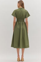 Another favorite of ours! This midi dress features a flattering silhouette that pulls in the waist with a front zipper detail. Includes a slight short sleeve for arm coverage if desired. The Olive color can be worn during multiple seasons.