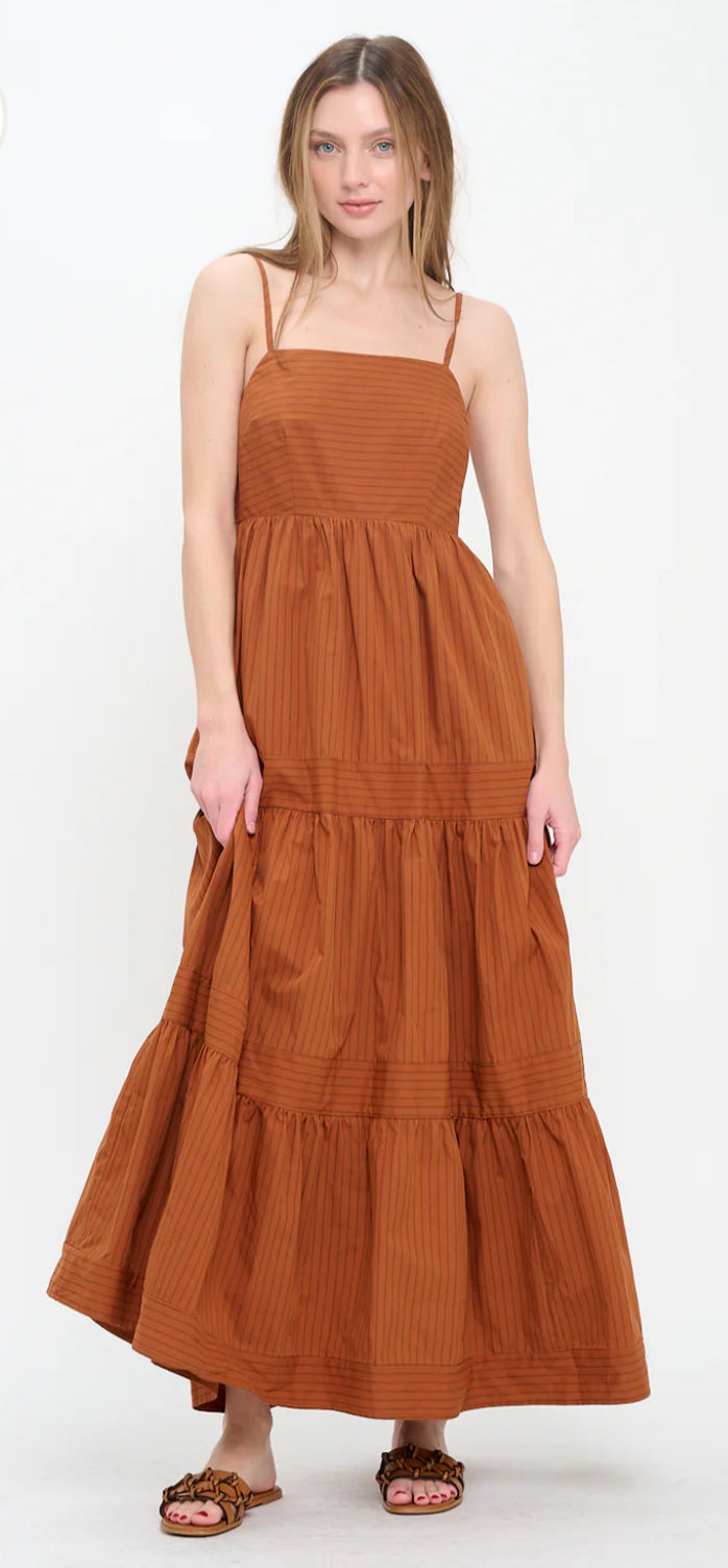 Radiate understated elegance in the Terracotta Ridge Maxi Dress, a timeless piece designed for relaxed yet refined moments. Crafted from lightweight woven fabric with subtle tonal stripes, this maxi features delicate spaghetti straps and a square neckline for a touch of modern simplicity. The tiered skirt flows gracefully, offering effortless movement and comfort, perfect for sunlit strolls or alfresco gatherings. Its earthy terracotta hue brings a warm, grounded charm, making it a versatile choice for both casual days and special occasions. Style it with woven sandals for a laid-back look or elevate with wedges and statement earrings for a chic evening ensemble.