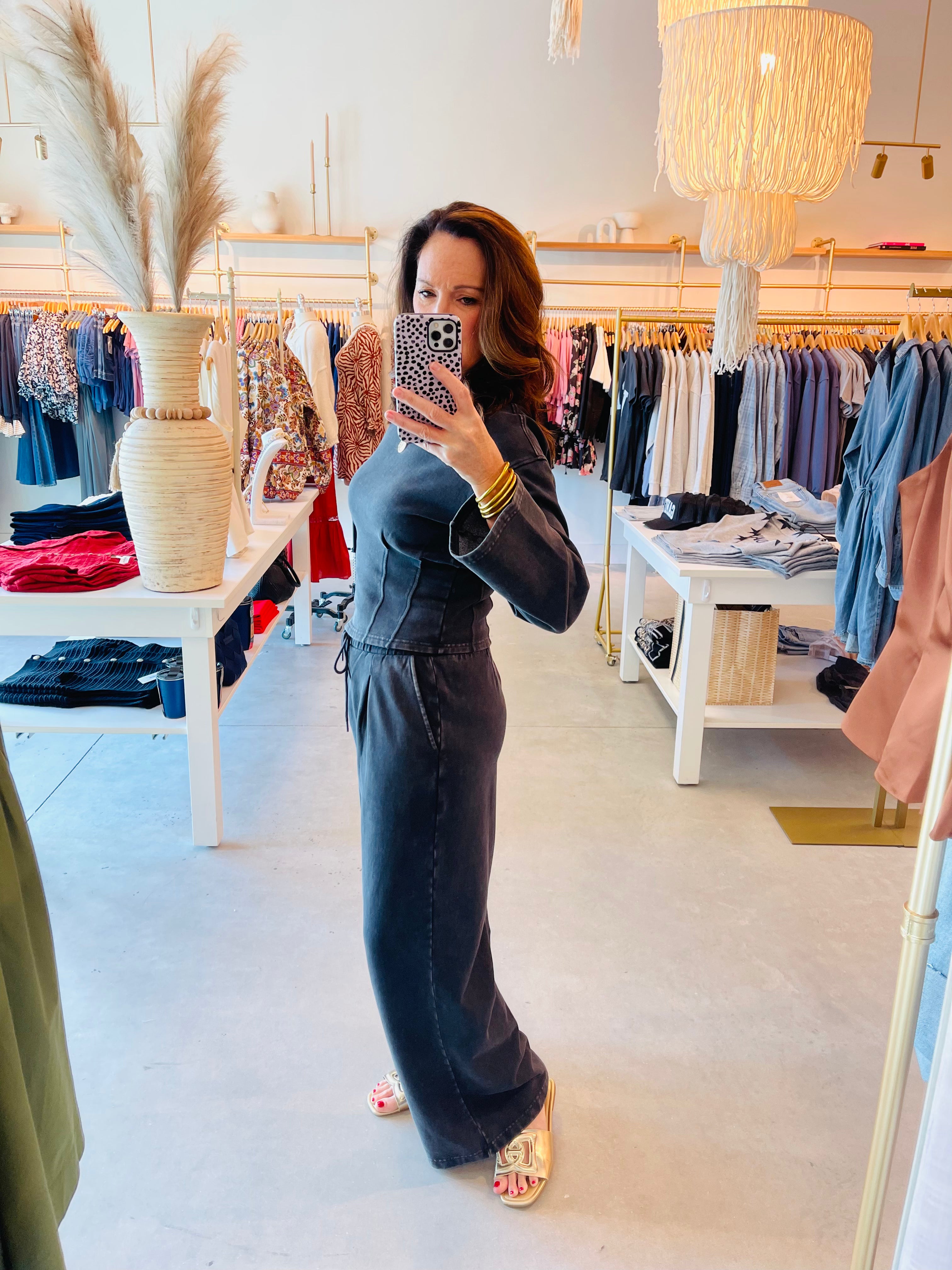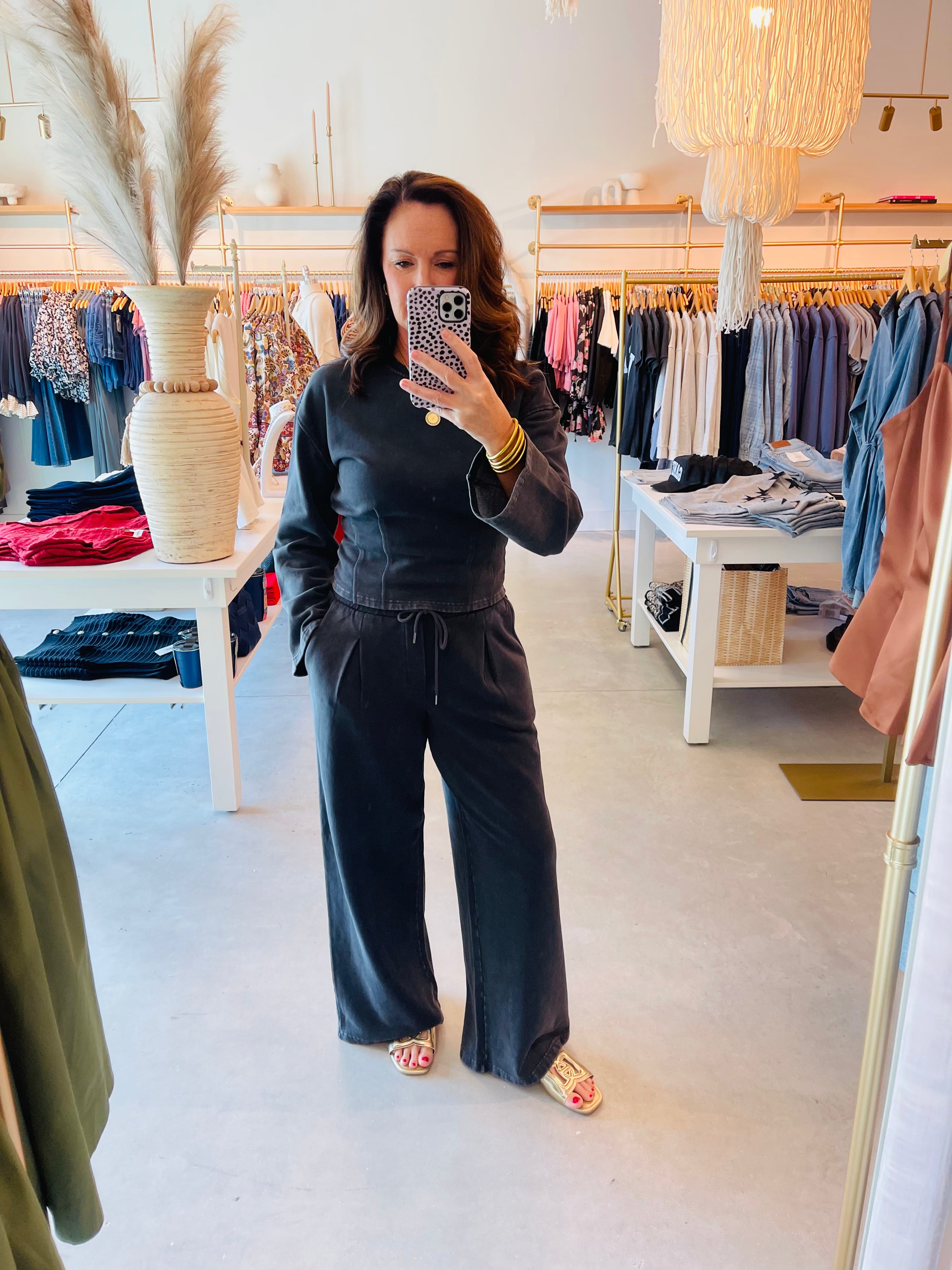 This ultra-comfy charcoal long sleeve pullover features a slightly cropped silhouette with a relaxed fit along with a tailored waist for a flattering shape.  Designed in a soft washed fabric, it effortlessly blends laid-back style with a touch of structure. Perfect for casual days, this elevated basic pairs seamlessly with the Carmelle pant.
