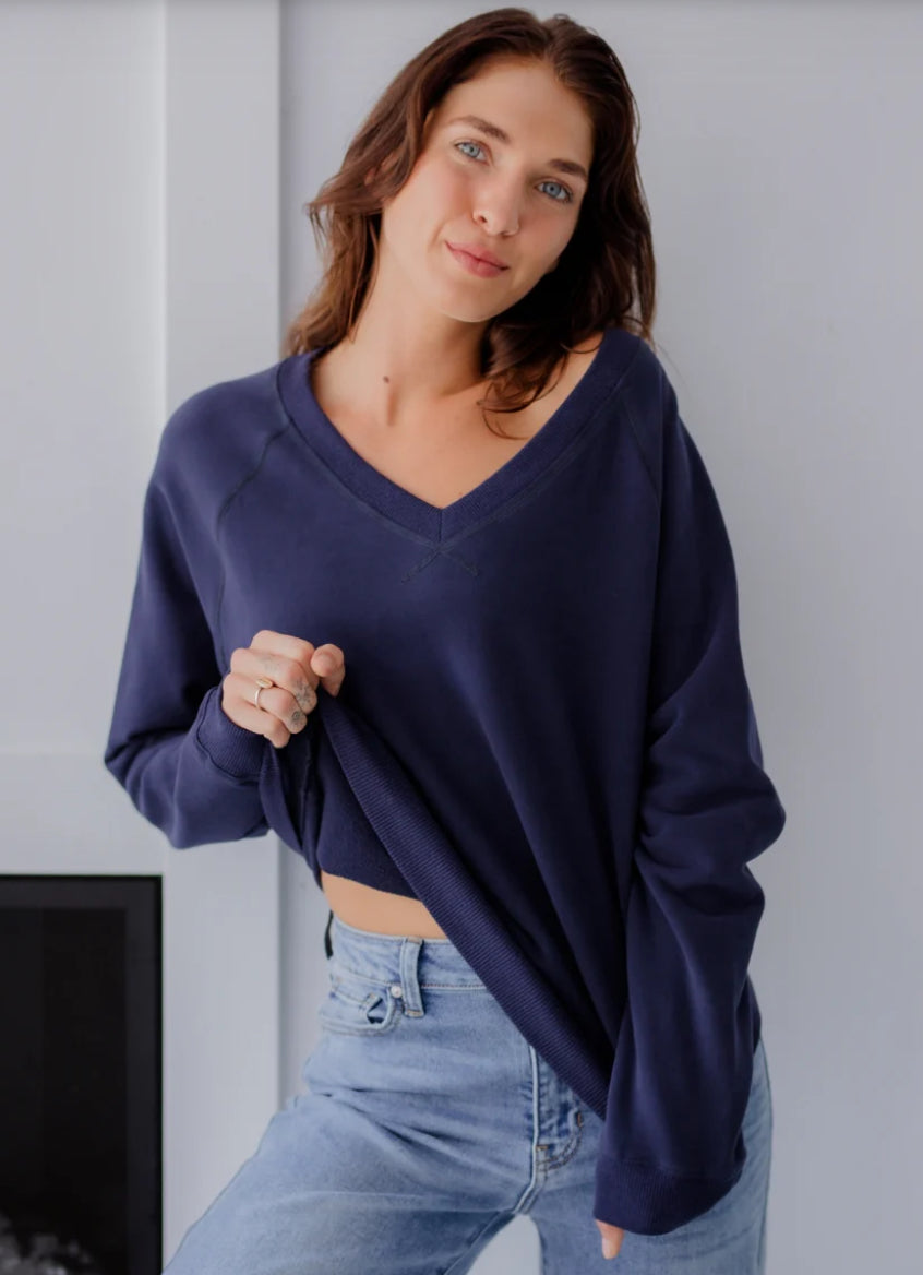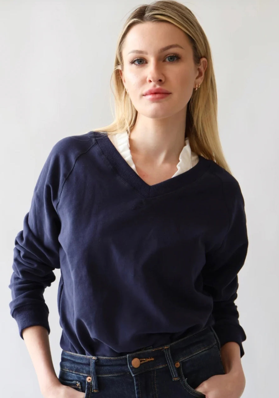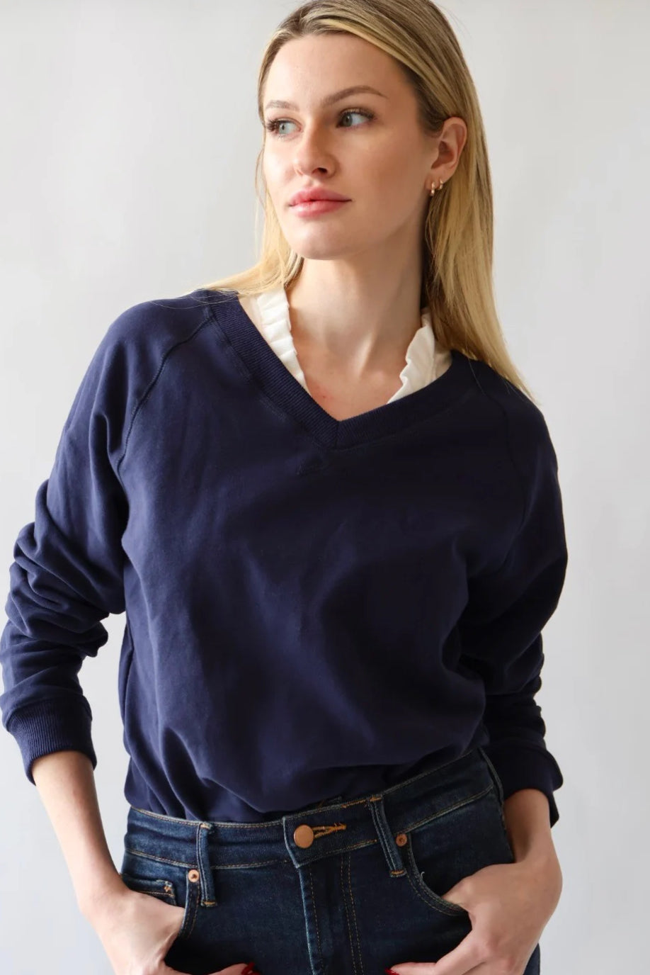 Elevate your casual wardrobe with our V-Neck Sweatshirt, thoughtfully designed for both comfort and style. This versatile piece offers a relaxed fit that’s loose without being oversized, hitting perfectly at the hip with just enough slack for a chic tuck. Crafted from the softest brushed cotton fabric, it provides unparalleled coziness while maintaining a polished look. Whether you're lounging at home or stepping out, this sweatshirt is bound to become one of your favorite go-to tops.