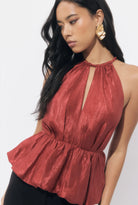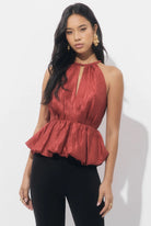 This top is crafted from a lightweight, textured fabric in a rich dark rust color. It features a flattering halter neckline with a back tie closure. The textured material and bold color make it an ideal choice for both professional and evening wear.
