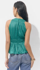 Crafted in a vibrant emerald hue with a subtle shimmer finish, this halter top features a flattering V-neckline, a fitted waist with tie detail, and a flowy peplum hem for a feminine silhouette. The open-back halter design adds a touch of sophistication and ease.