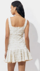 Designed with a flattering square neckline, fitted bodice, and a playful flared hem, this dress delivers the perfect balance of elegance and femininity. The ivory tweed fabric is accented with subtle embroidery, making it versatile yet elevated.