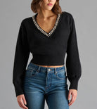 The Evilyn Sweater is a cropped black knit sweater features a stunning deep V-neckline adorned with sparkling silver embellishments, acting as a built-in necklace. Its flattering wide waistband and feminine voluminous sleeves make it a stylish piece for pairing with high-waisted denim or trousers. Soft and cozy yet perfectly glamorous, this sweater is designed to elevate your look instantly for any evening out.