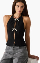 The perfect festive top for your holiday season. This halter style features beautiful crystal bow details. Dress up a pair of denim or pair with a velvet skirt for a great holiday look.