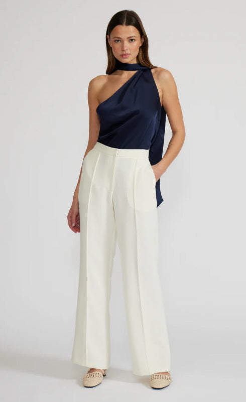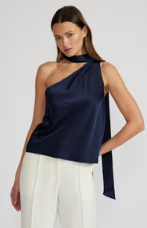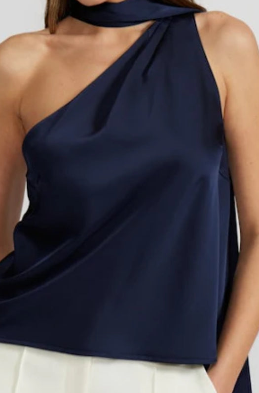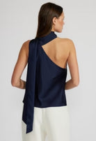 Discover true elegance with the Susan Tie Neck Top in Navy. Its graceful asymmetrical silhouette, crafted from luxurious satin, is complemented by a refined tie neck scarf. An exquisite choice for those who appreciate sophisticated style and timeless fashion.