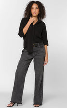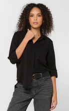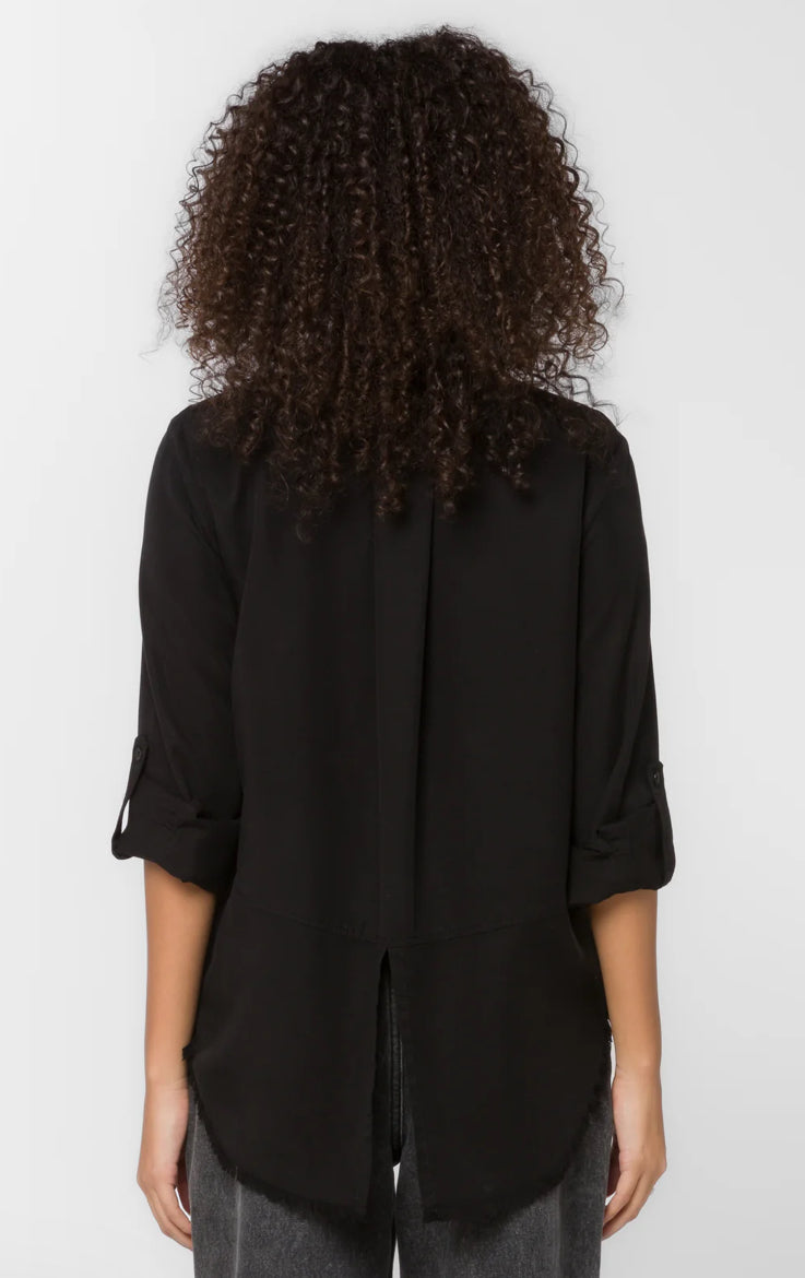 This Riley Frayed Black Shirt will elevate your wardrobe with its rolled tab sleeves, button up style, and unique features such as chest patch pockets, split back tail, and fray hem. Stay chic and comfortable in this playful shirt.