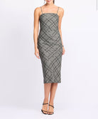 A sleek plaid midi dress with a modern, tailored fit. Features a square neckline, thin adjustable straps, and a smocked back for comfort and stretch. Subtle shimmer accents elevate the classic plaid design, making it perfect for both daytime sophistication and evening occasions. Pair with heels for a chic, refined look.