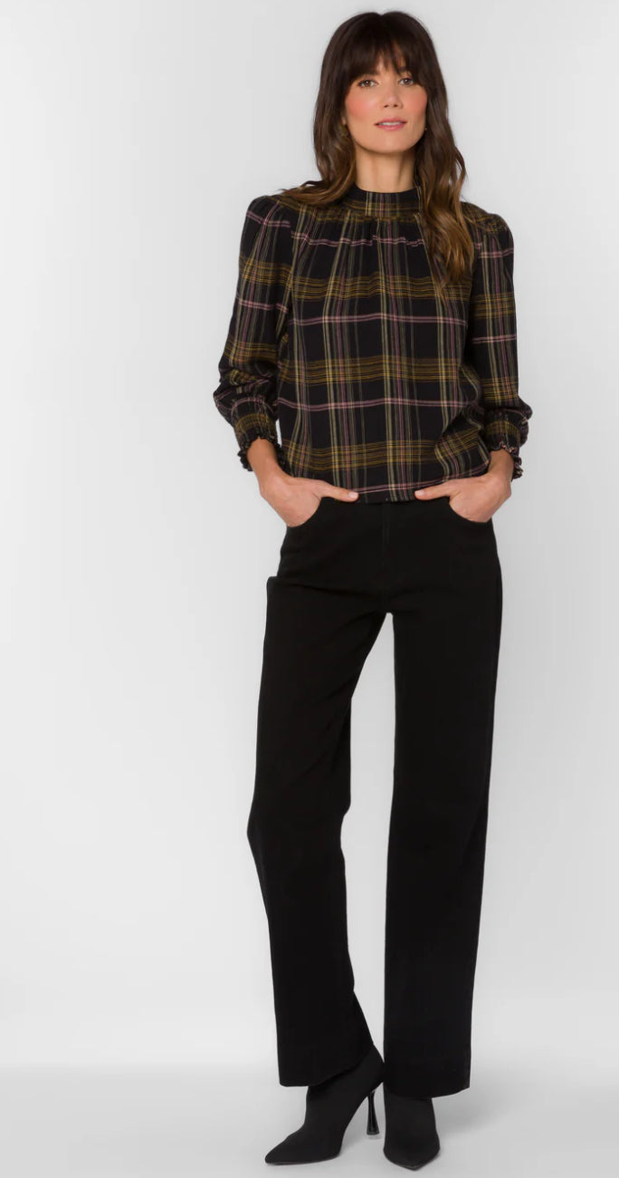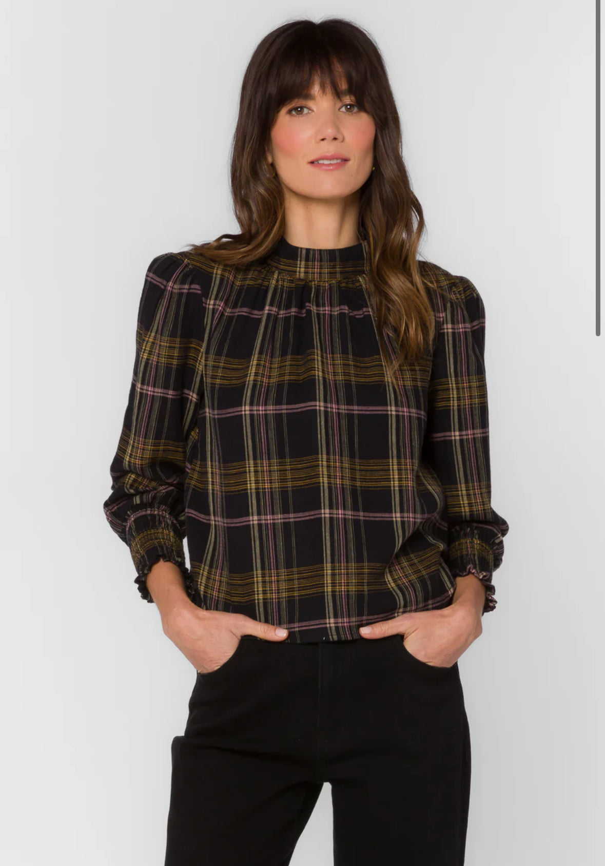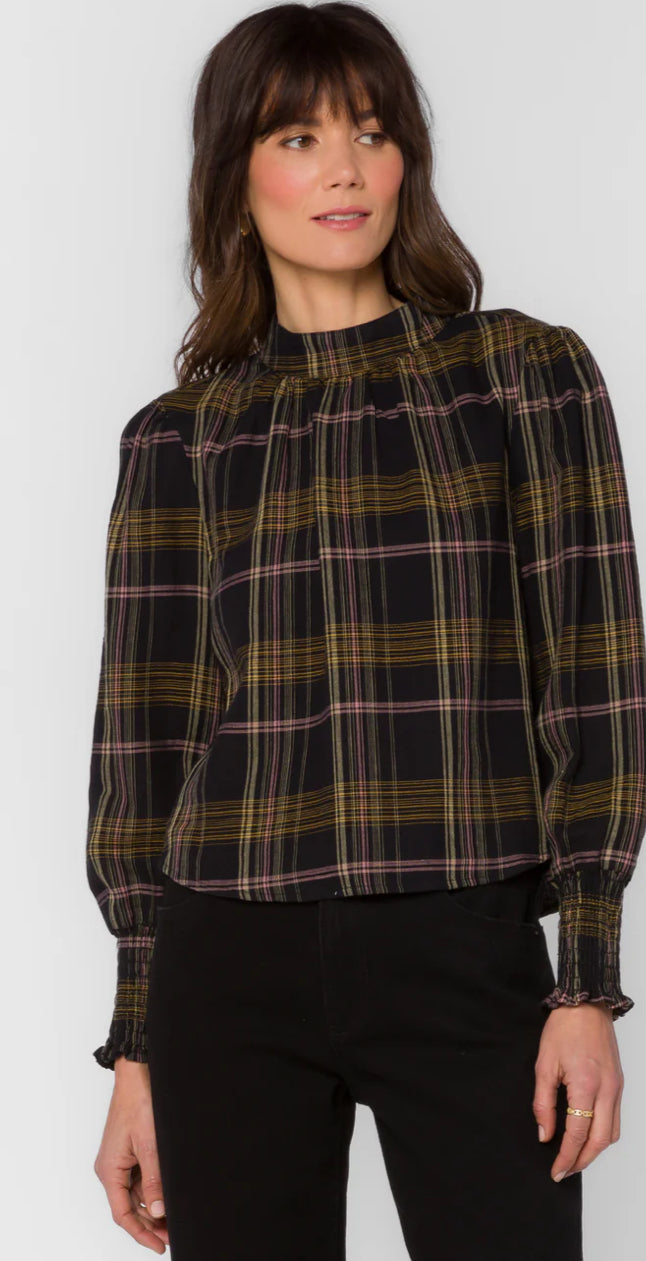 This Mock neck pop over top features a classic plaid design, balloon sleeves w/smocked cuffs crafted from with a medium-weight fabric with a soft and subtly structured feel.