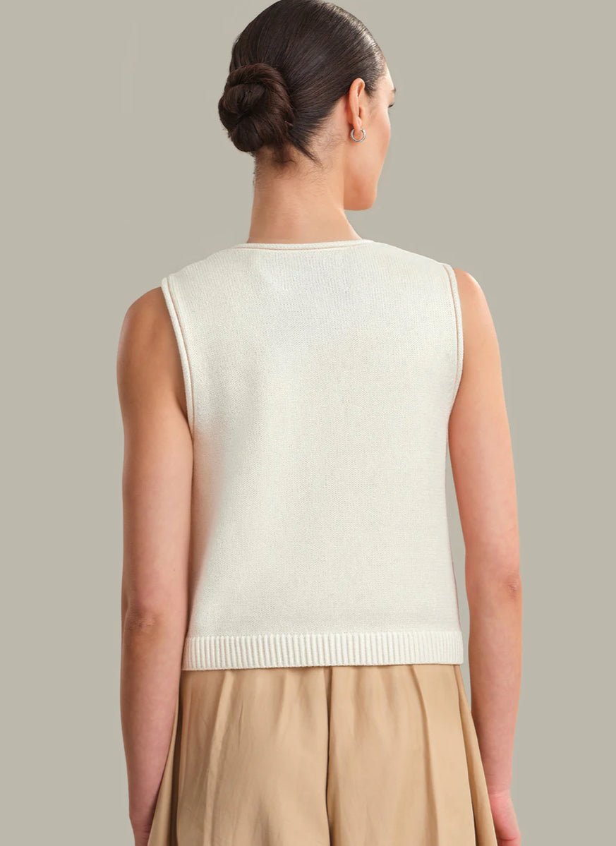 A refined take on a classic layering piece, the Ella: Cotton Button Front Sweater Vest is finished with a button-front closure and subtle rolled edges along the neckline and armholes. Effortless and versatile, it's a modern staple for everyday styling.