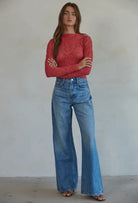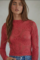 This top is sheer lace mock-neck top exudes modern femininity with a touch of edge. The intricate mesh pattern adds texture and allure, while the fitted silhouette and cropped hem make it perfect for pairing with high waisted skirts or tailored trousers.
