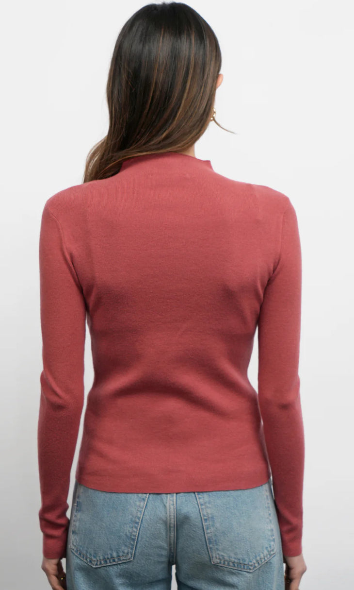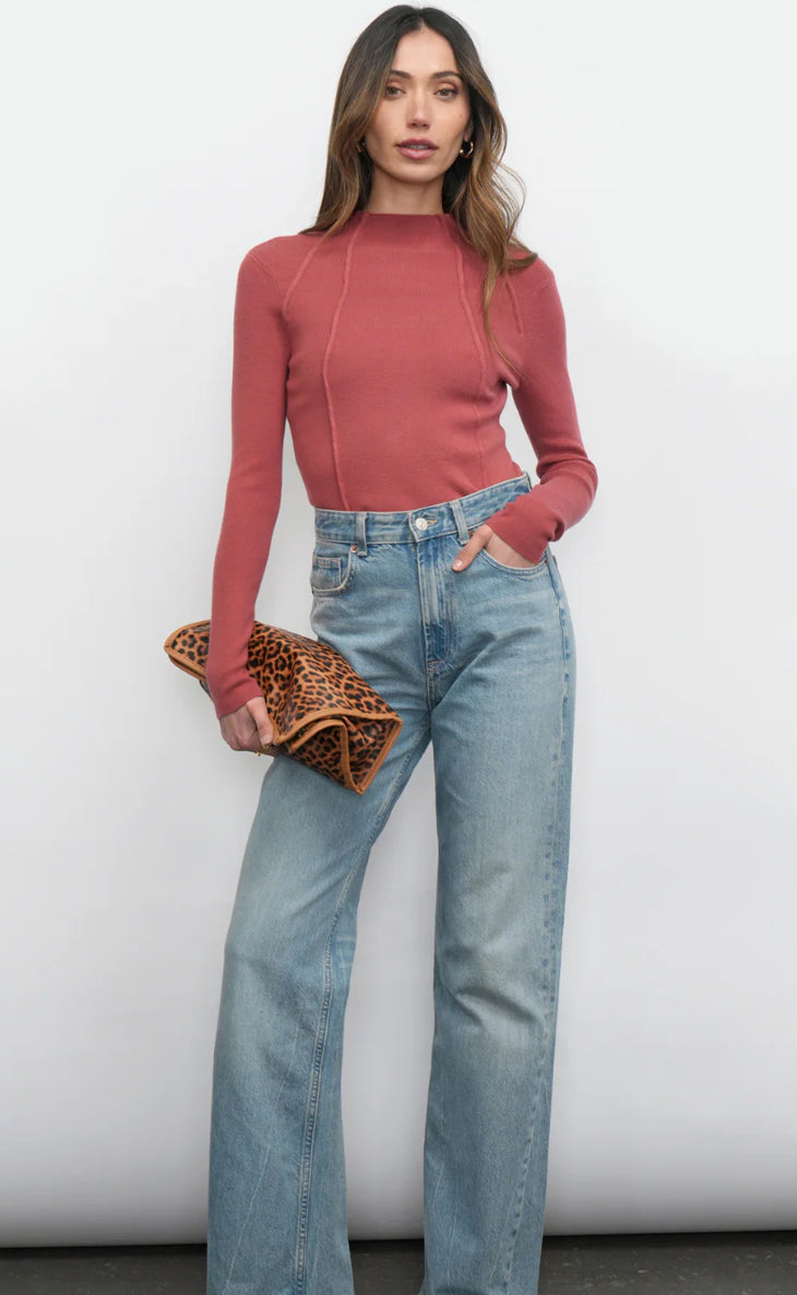 This chic long-sleeve knit top, available in a versatile cream and a sophisticated dusty cedar hue, offers a sleek, fitted silhouette and a modern mock neck. Its defining feature is the stylish exposed stitching that traces the seams, adding a deconstructed detail and visual interest.