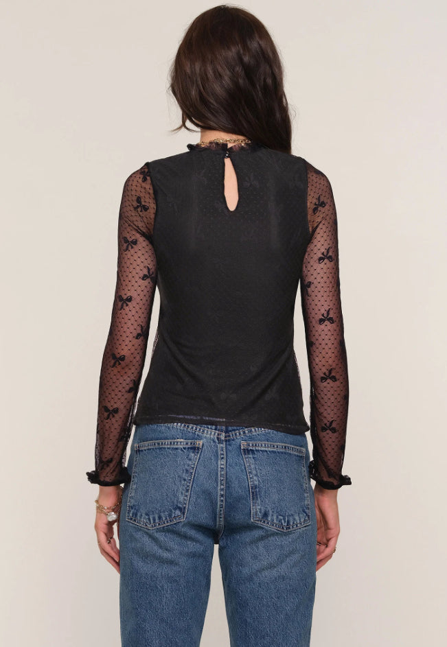 The Woodson Top is made from a pretty, stretch mesh. It has a crew neck, slim fit and delicate ruffles at the neck and cuffs. The body is fully lined.