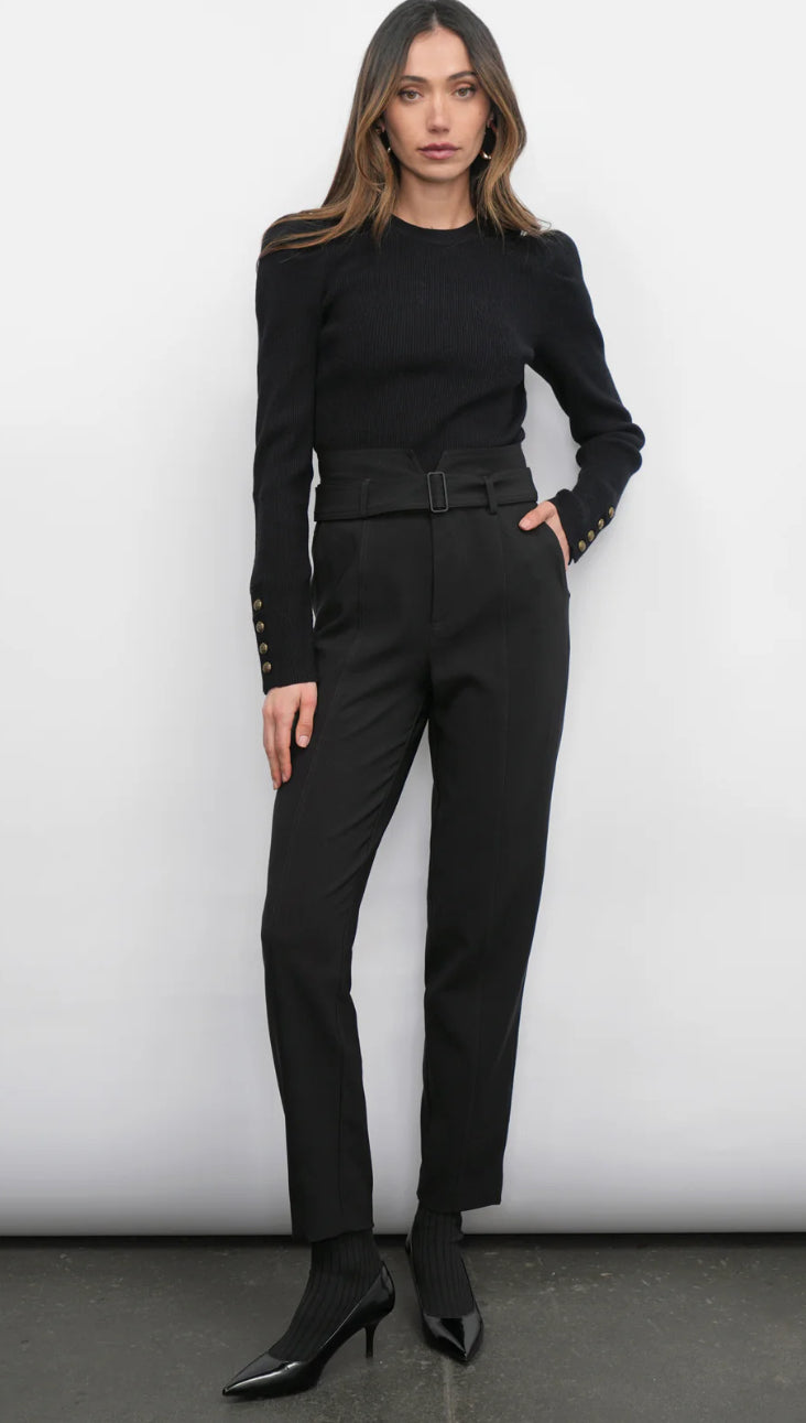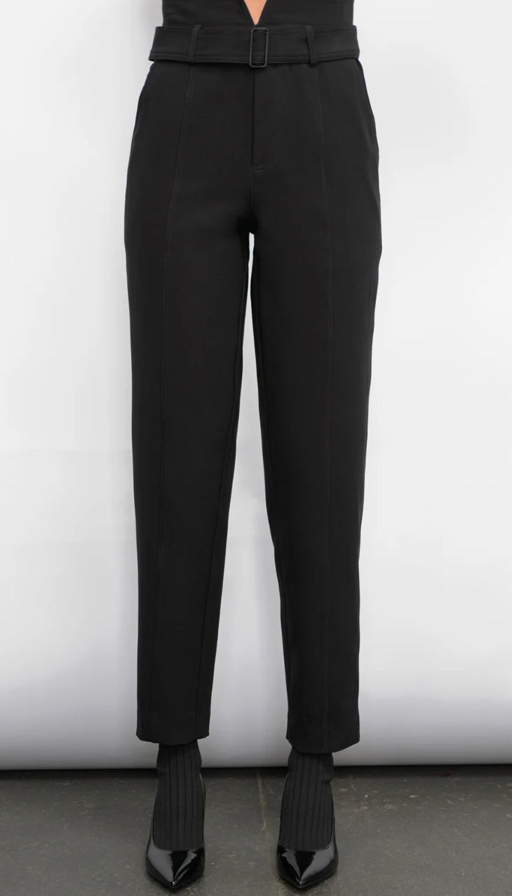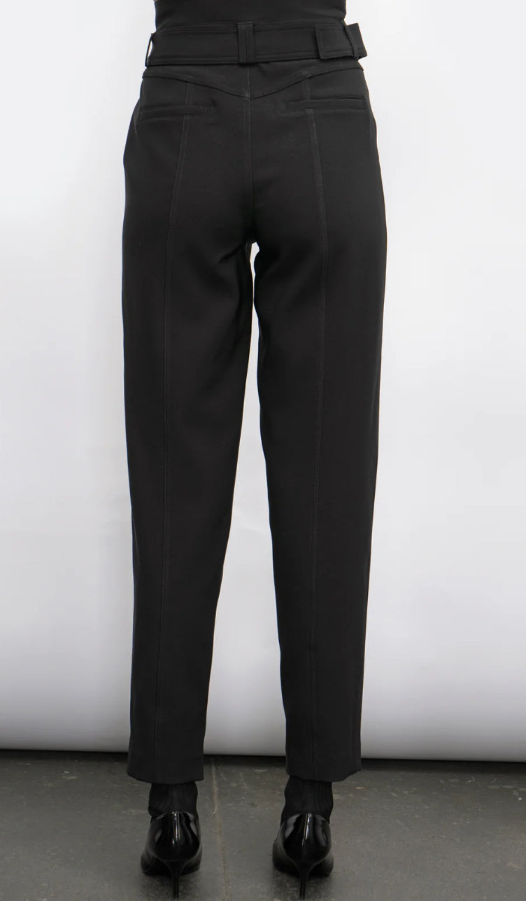 These pants are crafted from a smooth, lightweight fabric in a versatile black color. They are designed with a flattering high-waisted "paper bag" fit, which is cinched with a matching fabric belt to create a defined waistline. The pants feature a relaxed, slightly tapered leg and side pockets for a blend of comfort and style.