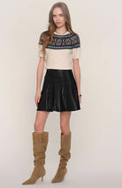 The Athena Skirt is made from a soft, faux leather. It sits at natural waist, flares out at the sweep and is mini length. We love it paired with chunky boots and a cool sweater.