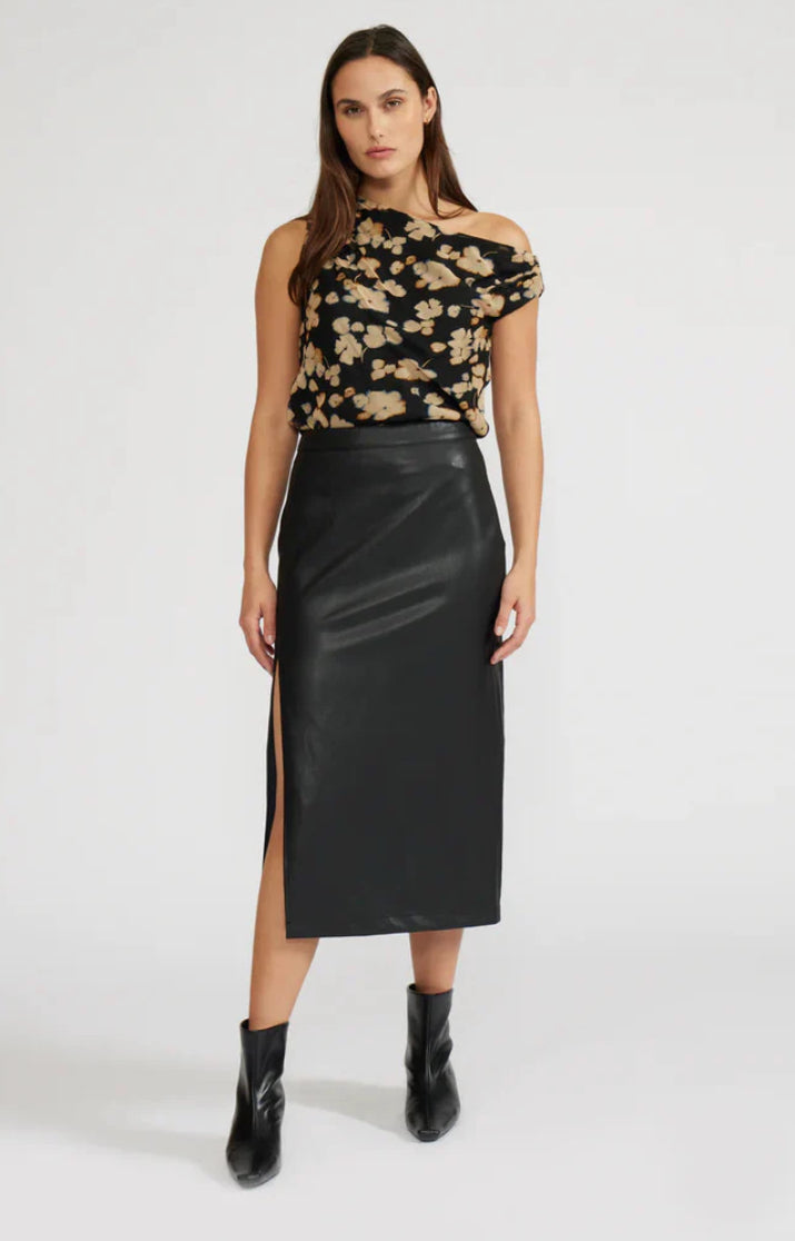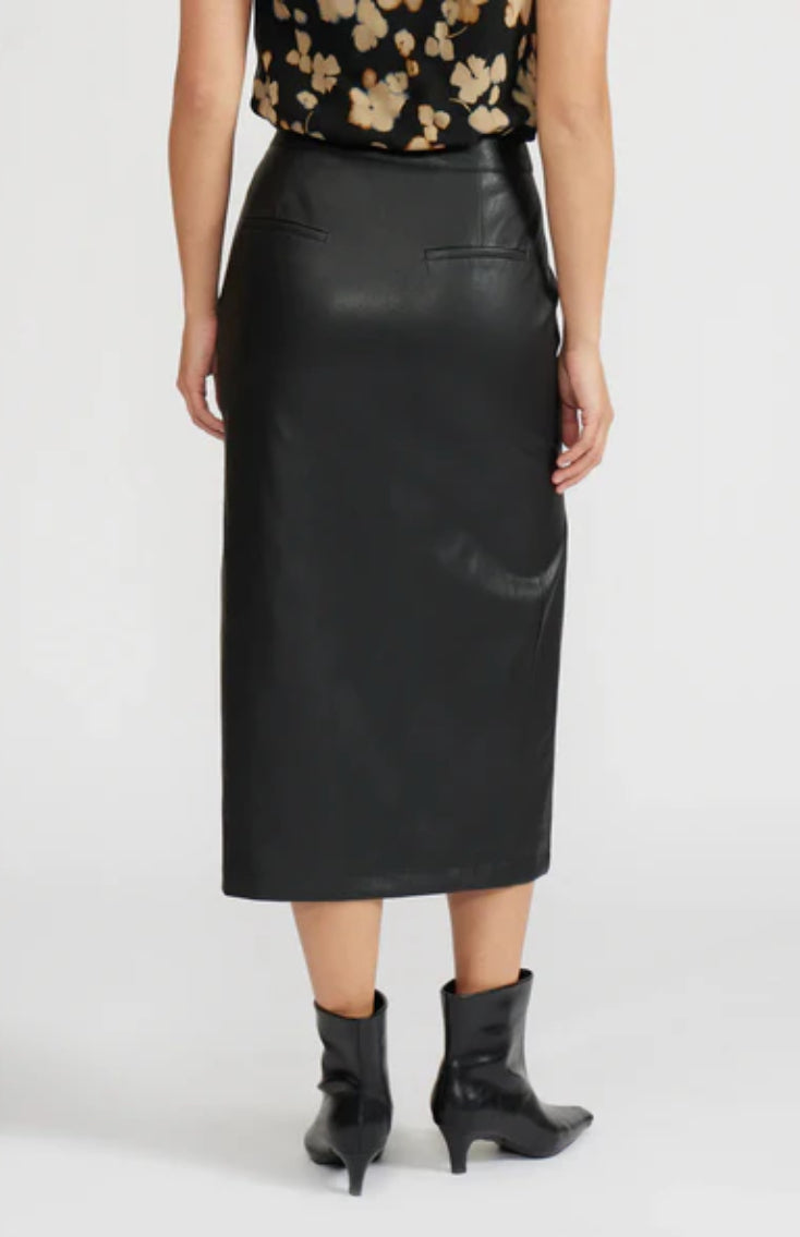 A great midi skirt to add to your wardrobe! This leather skirt features a faux pocket in the back with a side slit in the front for extra deail. The faux leather skirt is a great option to wear to work or for a night out in the town. Pair with heels, fashion sneakers, or your favorite booties.