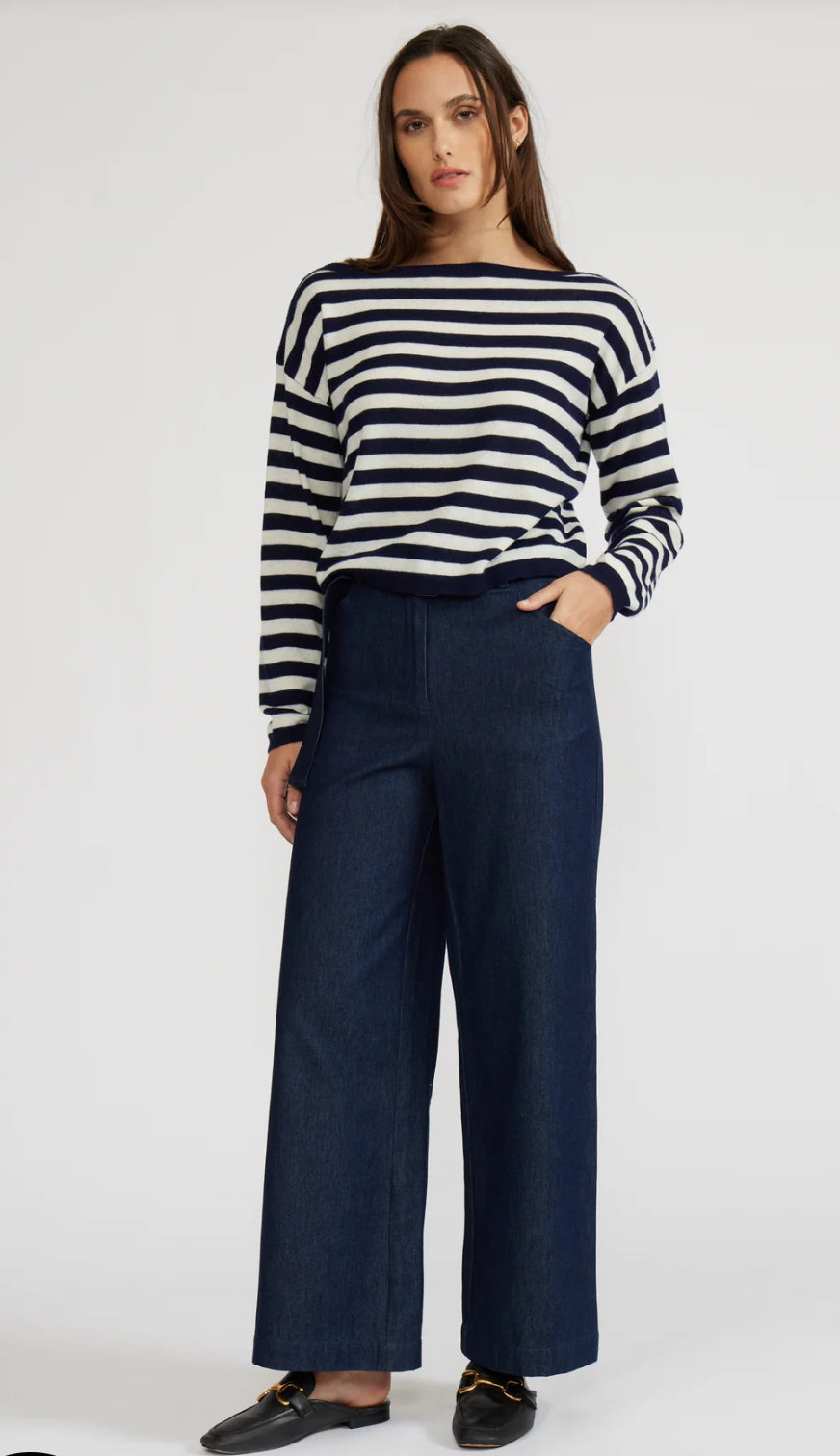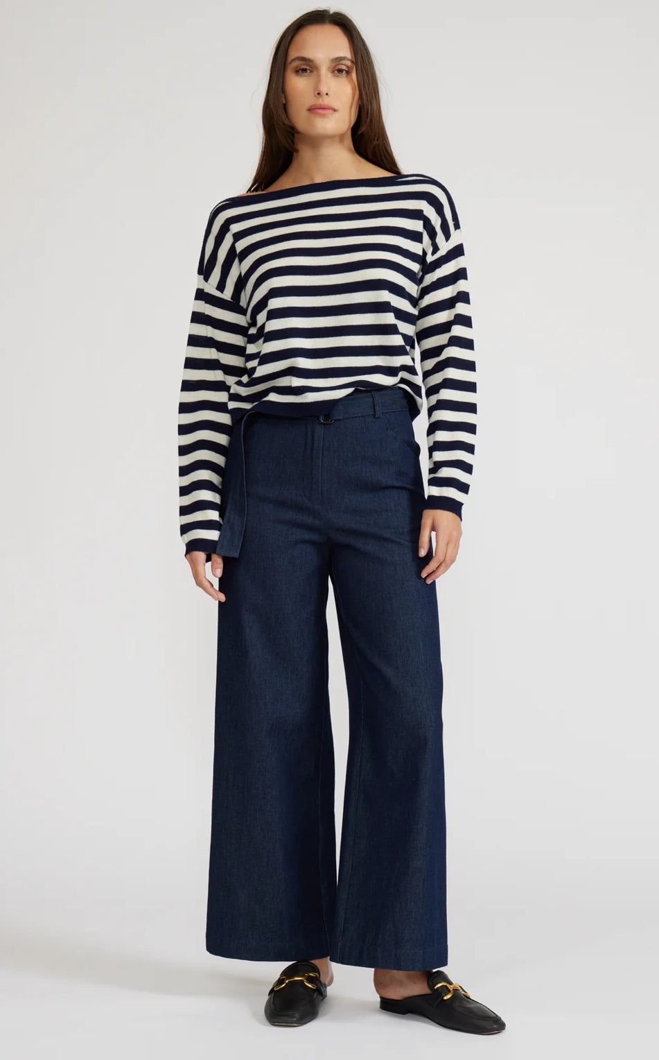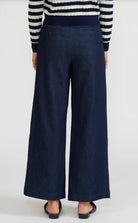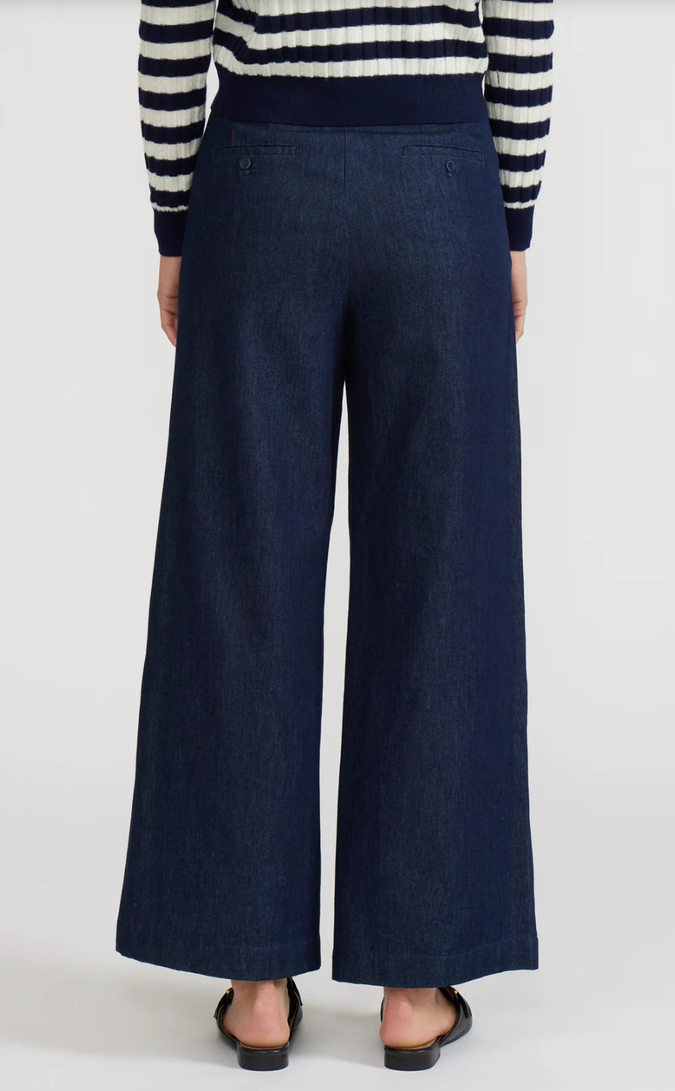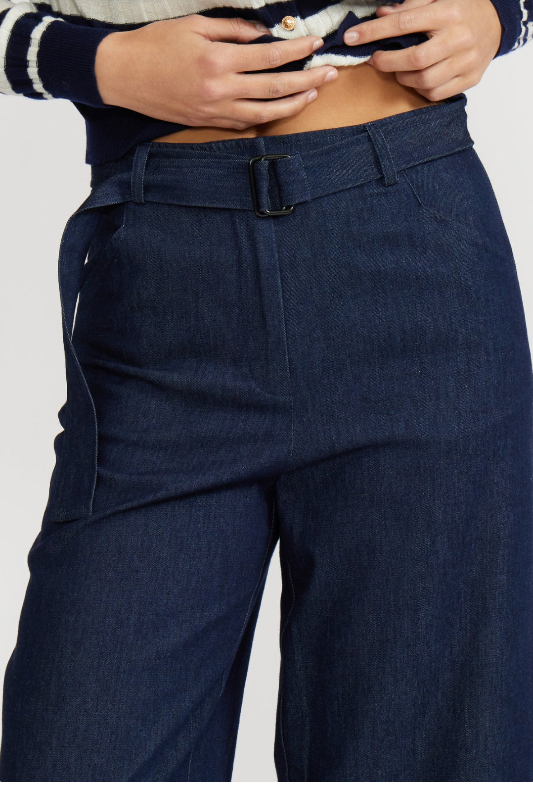 These wide-leg denim trousers are the perfect blend of structure and ease. Designed in a deep indigo wash, they feature a flattering high-rise waist, clean front, and side pockets for everyday wearability. The relaxed, wide-leg silhouette creates an elongating effect while offering all-day comfort. Finished with a sleek removable belt for styling versatility, these trousers pair seamlessly with everything from a tucked-in striped knit to a crisp blouse, taking you from casual chic to elevated polish with ease.