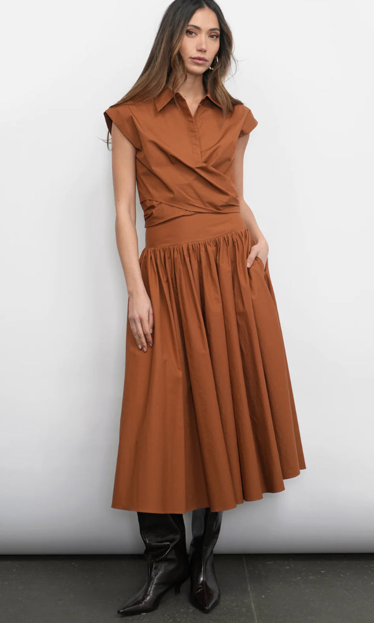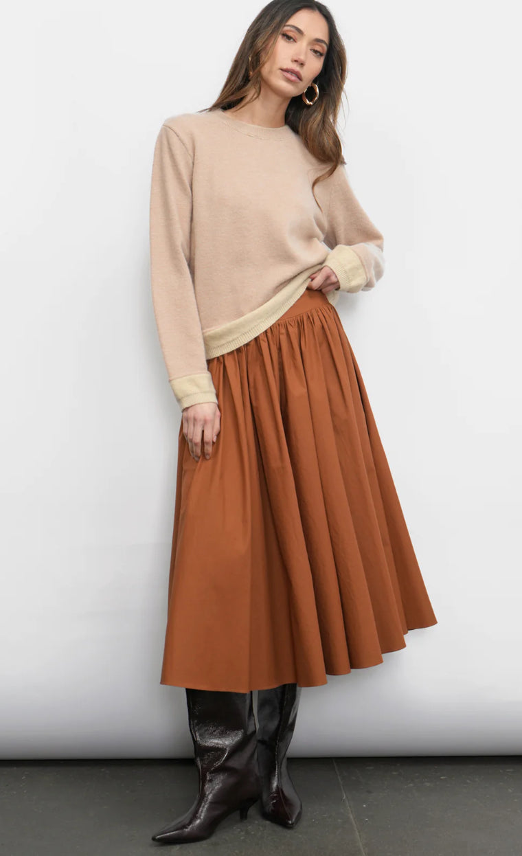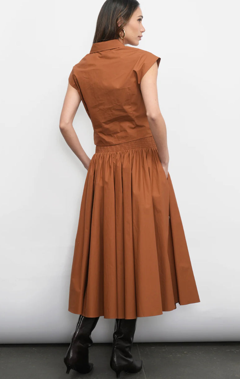 It features a flattering high-rise smocked waistband that beautifully cinches the silhouette, before flowing into a voluminous, gathered midi-length skirt. The generous cut and structured drape create a dynamic A-line shape that moves with graceful elegance.