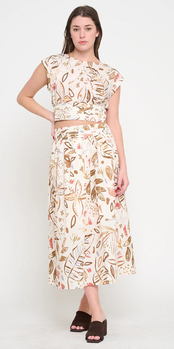 Bring a touch of natural elegance to your wardrobe with the Olive Grove Set, a breezy matching ensemble perfect for warm days and effortless style. Crafted from lightweight woven fabric, the set features a cropped cap sleeve top with a wide ruched waistband for a flattering fit. The coordinating high-waisted midi skirt flows gracefully, adorned with an abstract botanical print in earthy tones. Wear the pieces together for a polished, put-together look, or mix and match with your wardrobe favorites. Ideal for brunch dates, resort getaways, or casual gatherings, this set offers versatile styling and all-day comfort.