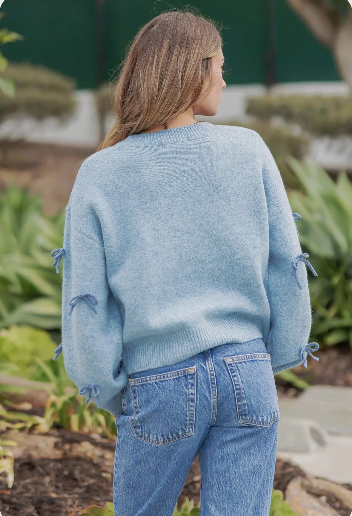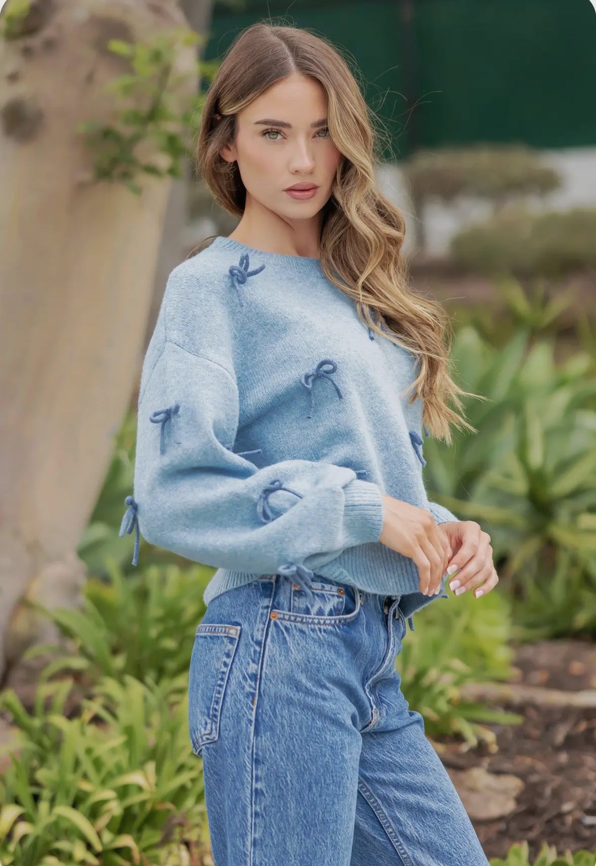 Bows embellished sweater in knitted fabrication. This cozy soft pullover sweater features tiny bows embellishment throughout, dropped shoulder, long sleeves with ribbed cuff, round ribbed neck, and ribbed hem.