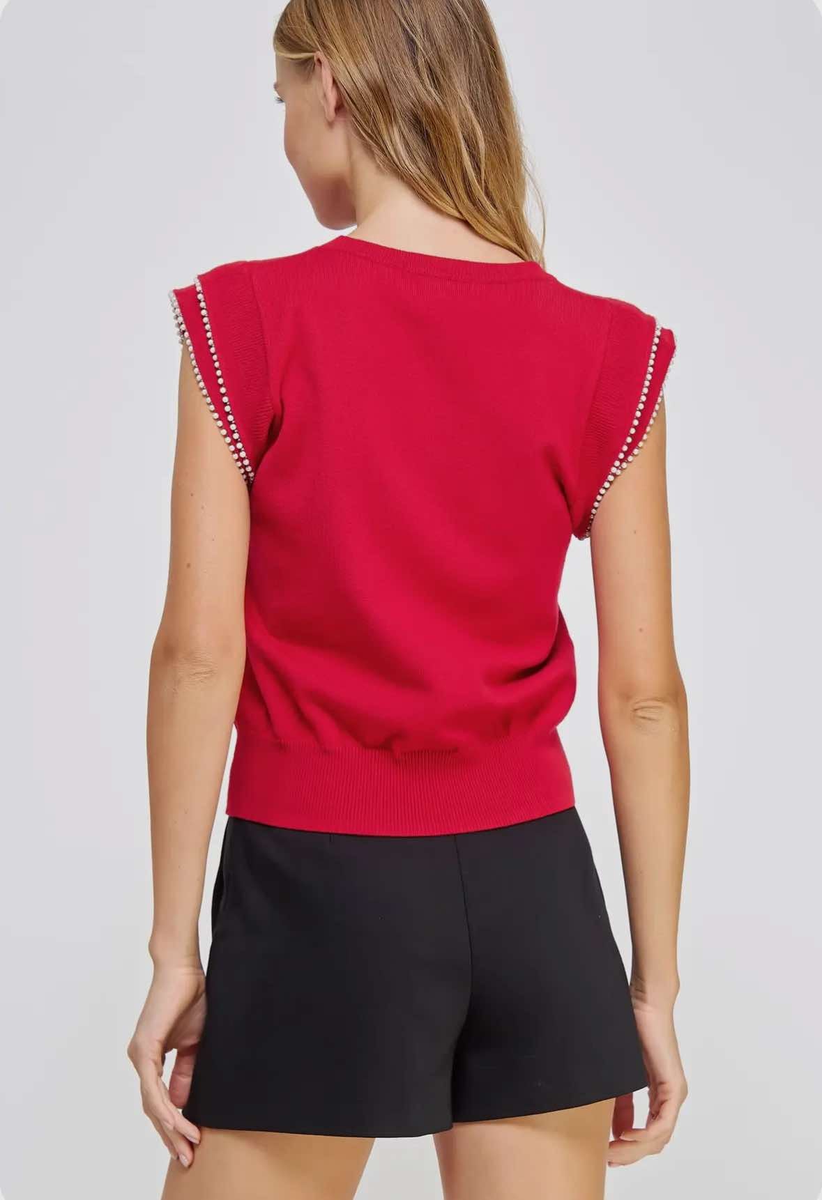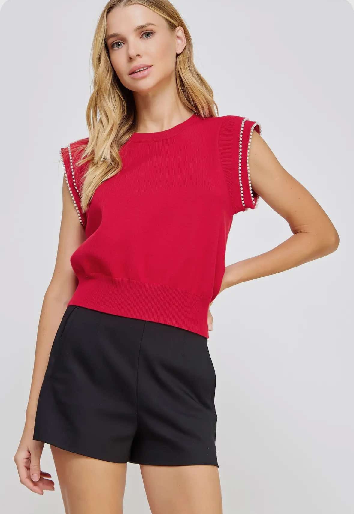 Ruffle double layered pearl short sleeve top in stretch knitted fabric. This style features double-layer ruffled short sleeves, pearl trim at sleeves, and ribbed round neck/hem.