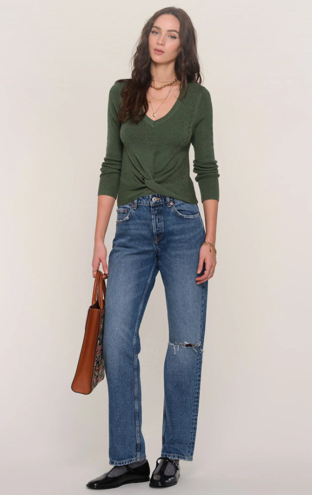 An update to an easy tee, The Zazie Top will be your new favorite staple. It is made from a soft melange knit. It has a relaxed fit and a cute twist front detail. Pair it with denim or shorts.
