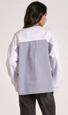This top a mixed media everyday essential. With long sleeves, subtle stripe accents, and a mix of knit and woven textures, this piece delivers structure and softness in equal measure. It’s the ultimate layering hero — wear it under coats or solo for an effortless, polished look.